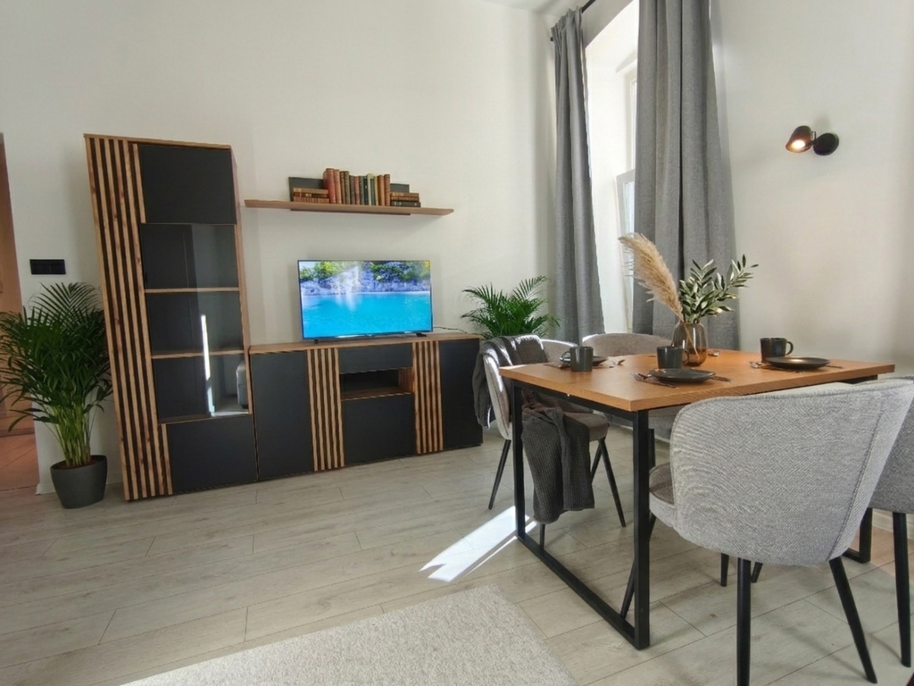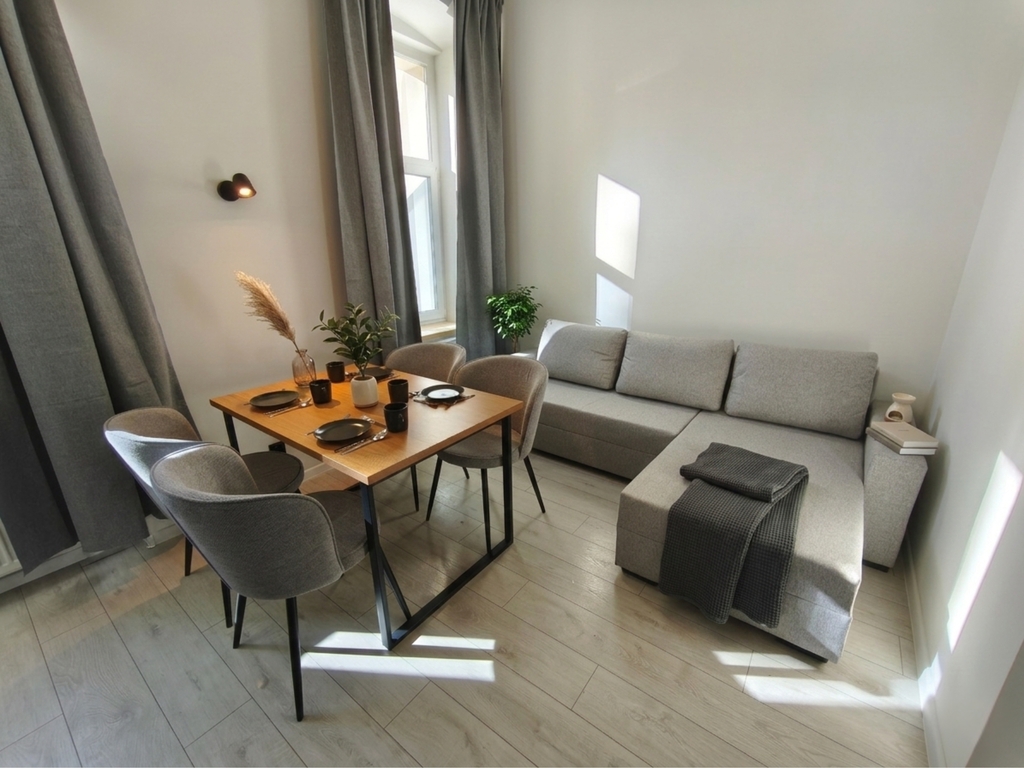 – salon z aneksem kuchennym (wygodny narożnik, smart TV, duży stół dla rodziny i gości, szafki na Twoje rzeczy),