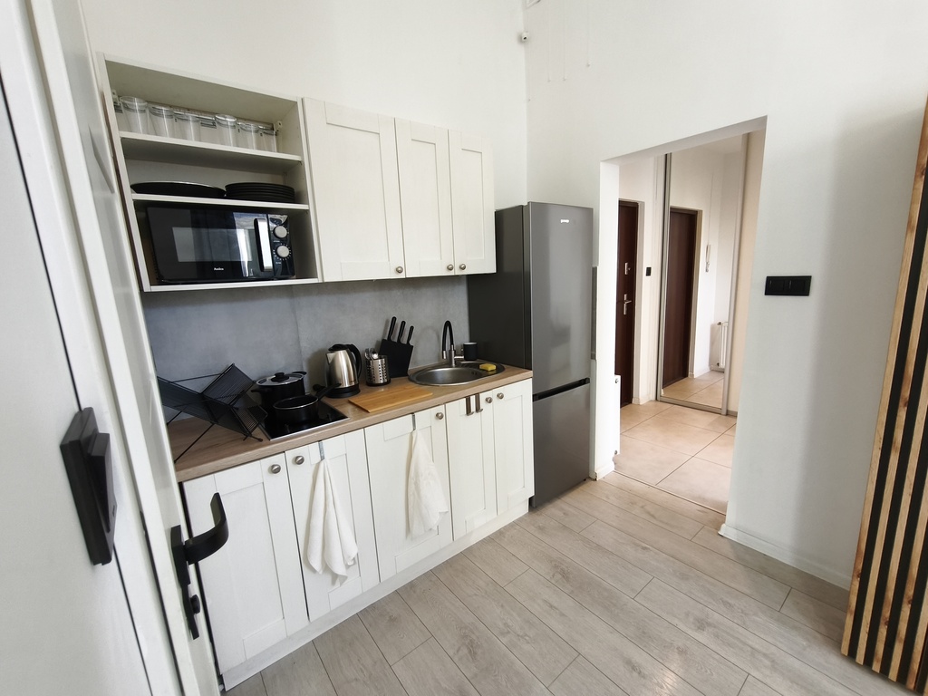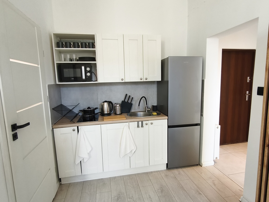 – aneks kuchenny (płyta elektryczna, pojemna lodówka, mikrofalówka, czajnik, zastawa stołowa, garnki, szklanki itd.),