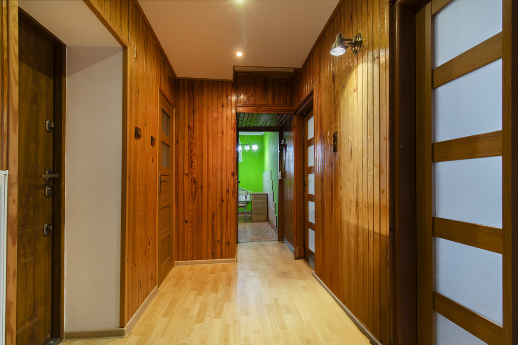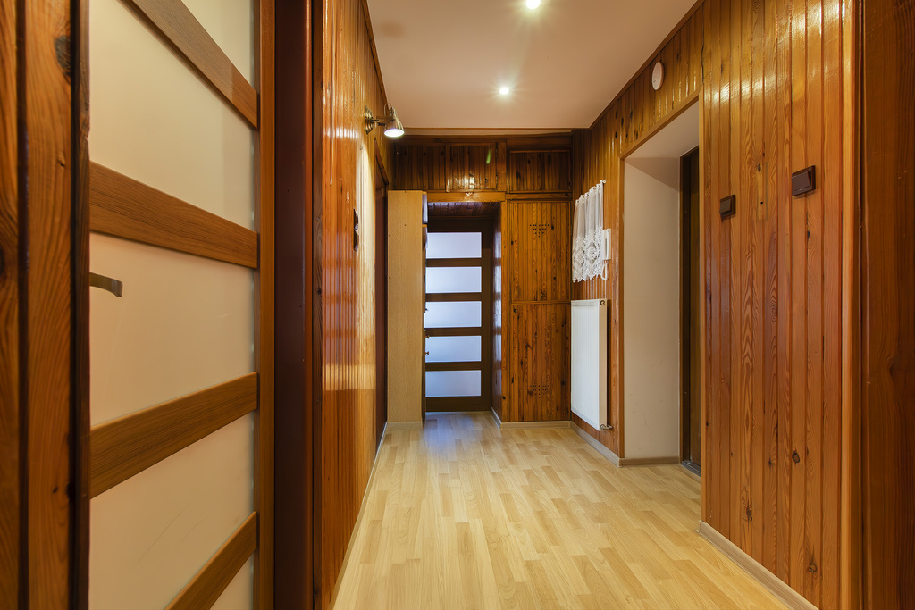 - Na podłogach panele – trwałe i estetyczne wykończenie.