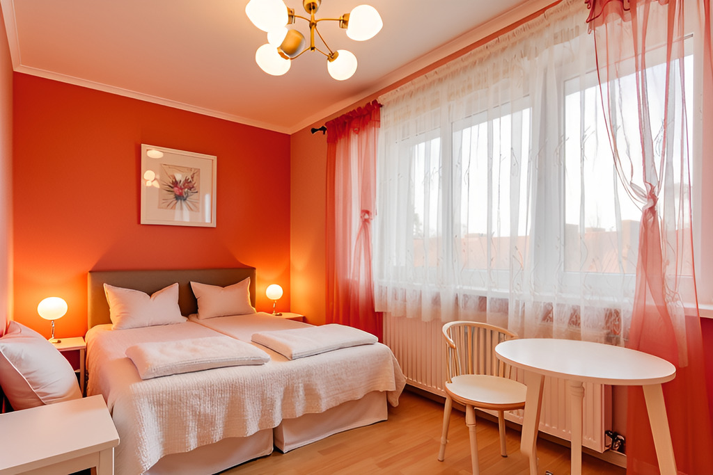 - Sypialnia: duże, wygodne łóżko oraz pojemna szafa przesuwna z lustrem w zabudowie.