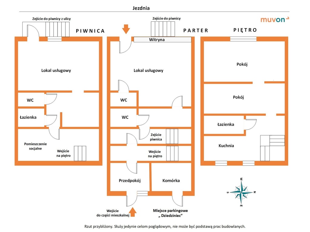 Parter – lokal usługowy około (45 m²): Z niezależnym wejściem od ulicy – idealne miejsce na: