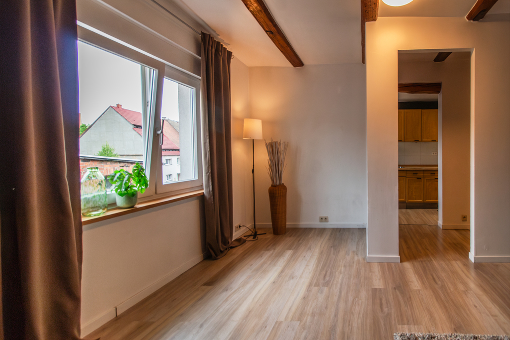 Na sprzedaż przestronna kawalerka w nowoczesnym, loftowym stylu, położona na 1. piętrze klimatycznej kamienicy w samym centrum Lubska.