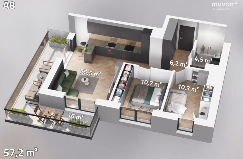 Mieszkania charakteryzuje przemyślany układ funkcjonalny, duże balkony/tarasy oraz ogrzewanie podłogowe.
