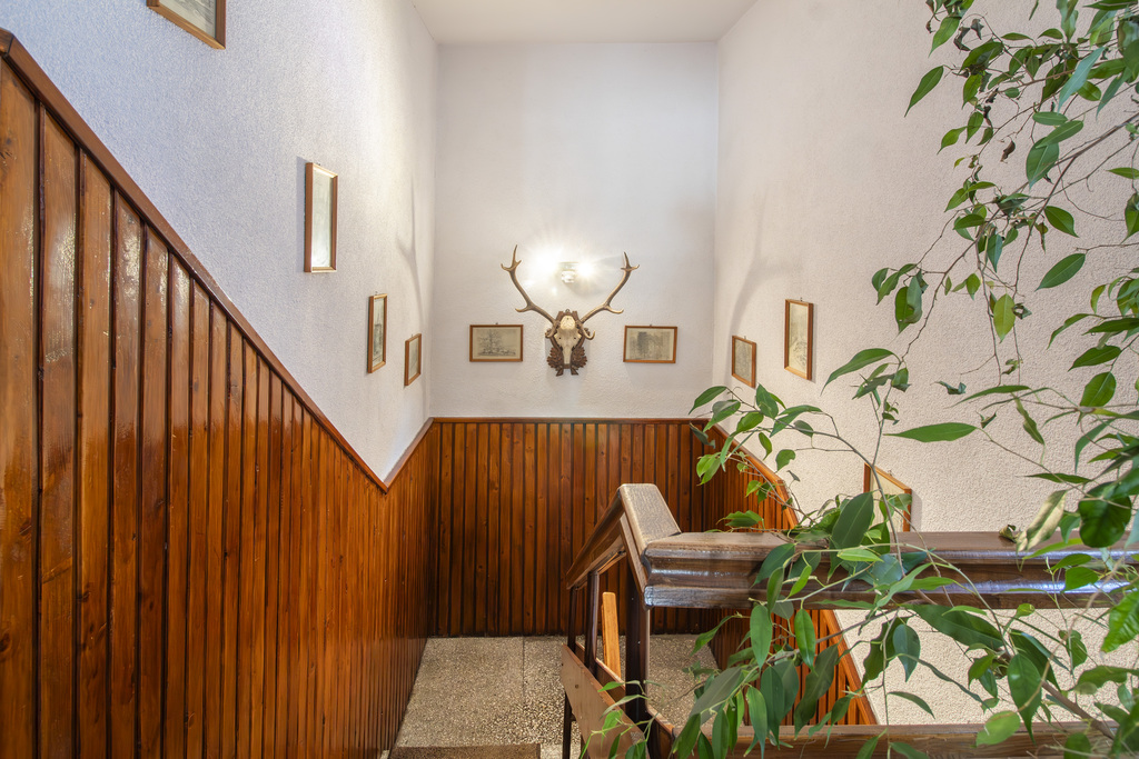 – Parter – część mieszkalna 4 pokoje, kuchnia, korytarz, 3 x przedpokój, łazienka (104,80 m² – do remontu) oraz gospodarcza (43,90 m²).