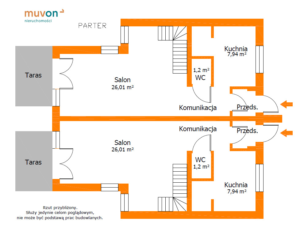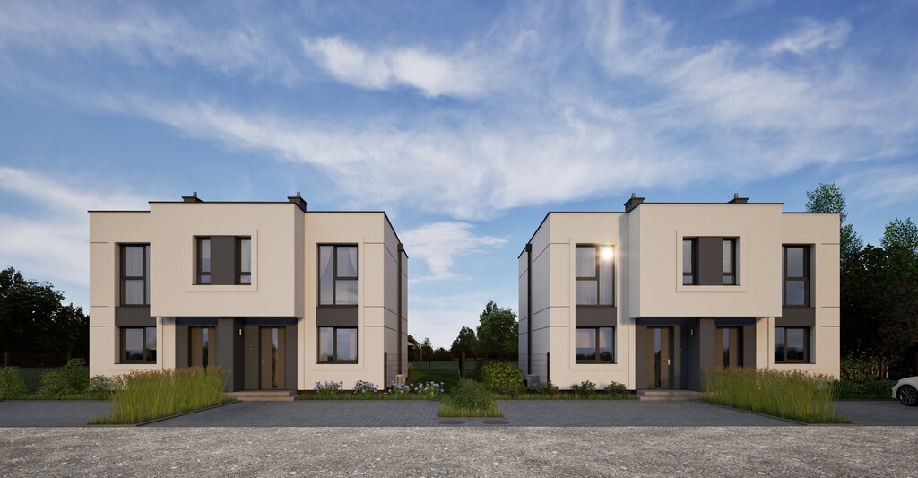 Nowoczesna przestrzeń do życia Każdy z domów to funkcjonalne 81 m² starannie zaprojektowanej powierzchni, rozłożonej na dwóch kondygnacjach. Parter to przestronny salon z aneksem kuchennym, łazienka i praktyczne pomieszczenie gospodarcze. Na piętrze – aż trzy sypialnie i druga łazienka – idealne rozwiązanie dla rodziny lub osób pracujących zdalnie.