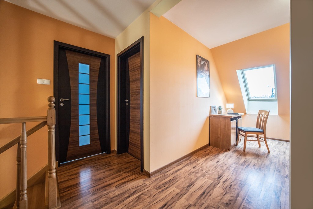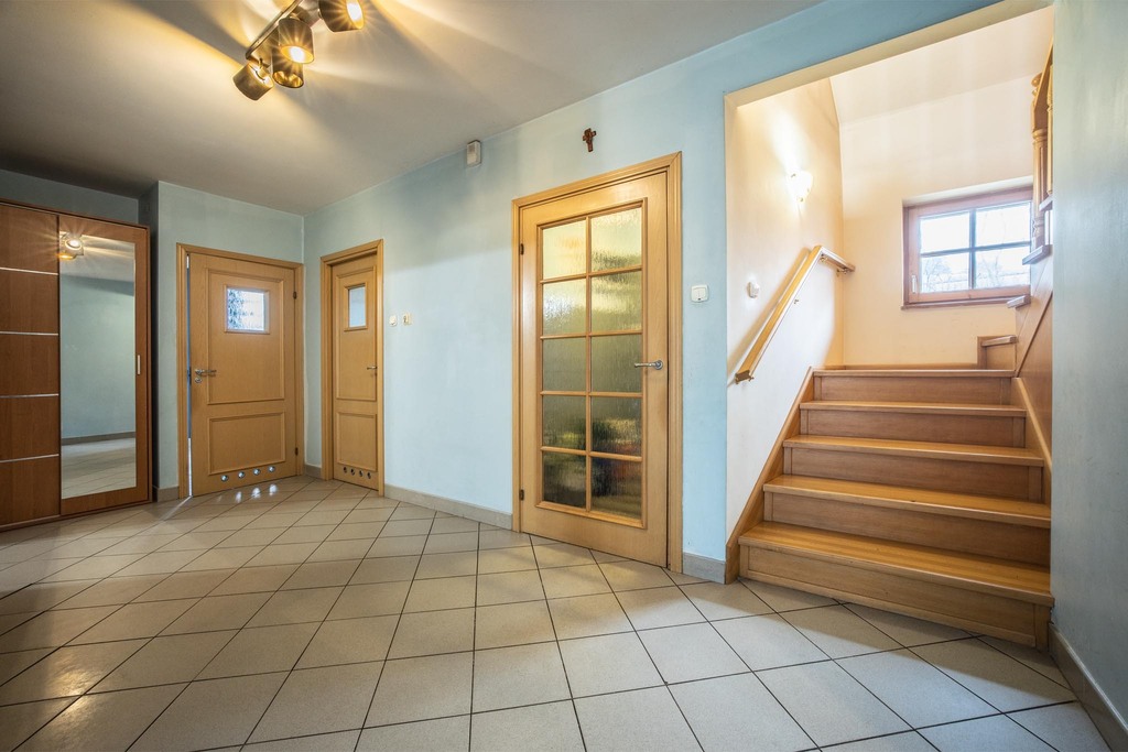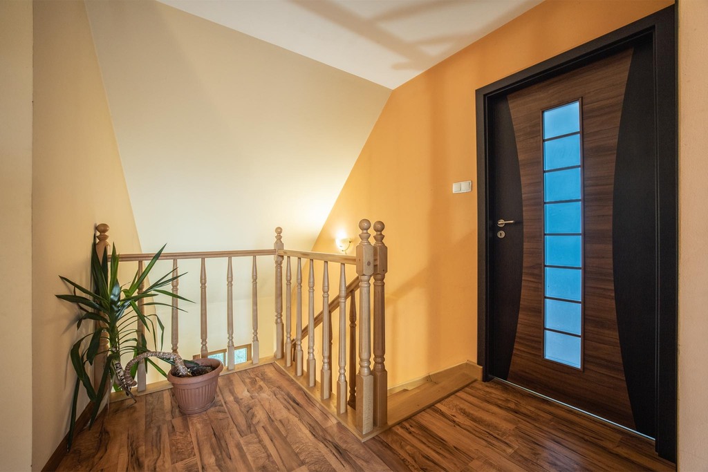 Drewniane schody dodają charakteru, a naturalne okna drewniane pięknie doświetlają wnętrza. Na podłogach panele i terakota – praktyczne i ponadczasowe rozwiązania.