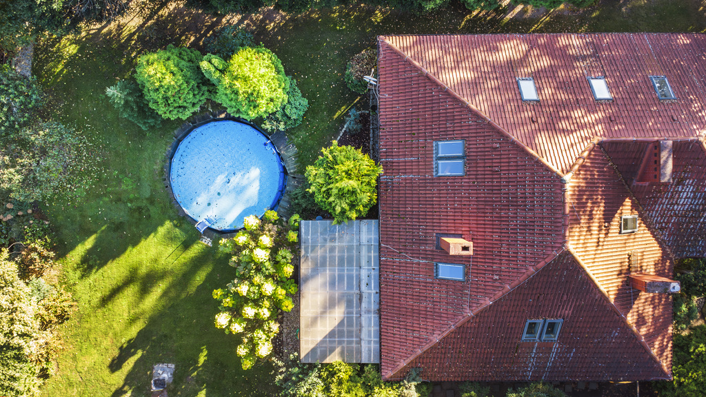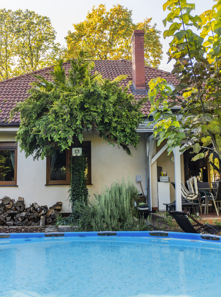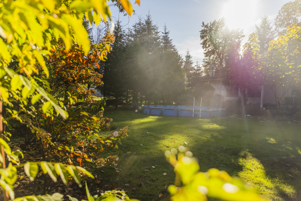 Działka została starannie zagospodarowana i zachwyca bogactwem zieleni, licznymi nasadzeniami oraz miejscem do odpoczynku. W ogrodzie znajduje się basen rozporowy, umieszczony w specjalnie przygotowanym zagłębieniu wyłożonym belami – rozwiązanie zarówno estetyczne, jak i praktyczne. Koło basenu mogą Państwo zobaczyć swoistego rodzaju „palmę” zrobioną z drzewa iglastego 🙂 Relaks w basenie pod palmami to coś, na co Państwo zasługują! Na ogrodzie znajduje się też składzik gospodarczy na narzędzia, altana oraz oczko wodne.