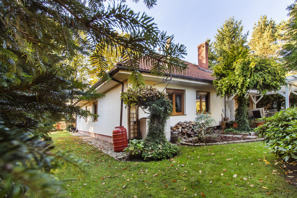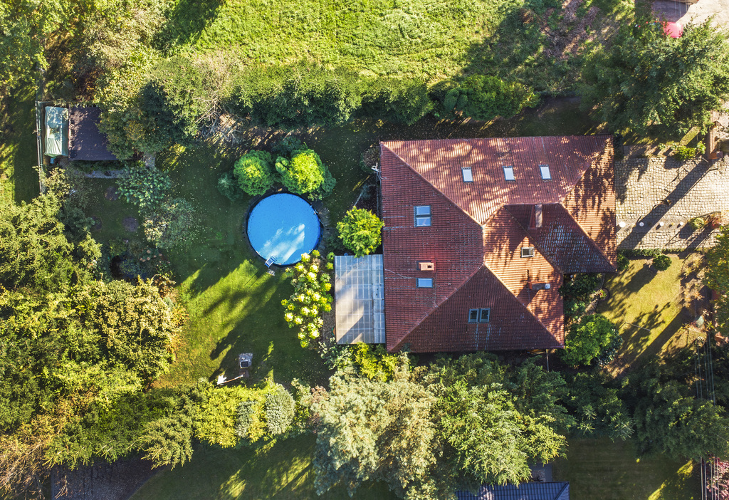 Udogodnienia na działce: basen wkopany w ziemię, altana, składzik na narzędzia, oczko wodne, liczne krzewy i drzewa owocowe.