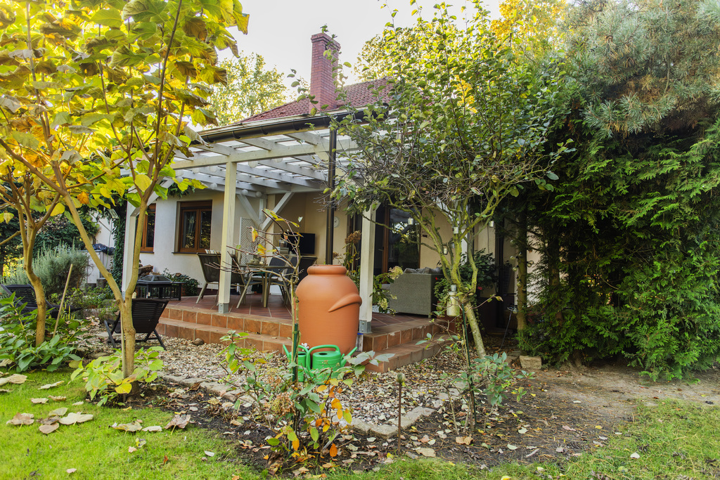 Działka jako całość ma w sumie około 14 arów, ale jest podzielona – na jednej części stoi dom, a na drugiej jest ogród.