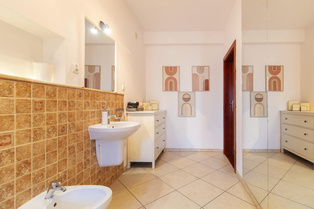 Obok mieści się otwarta kuchnia, duża łazienka (10,3 m²) z wanną, dwa pokoje – w tym jeden główny o powierzchni 26,6 m² (służący aktualnie jako biblioteka) oraz drugi mniejszy – sypialniany (10,8 m²), mogący pełnić funkcję gabinetu lub pokoju gościnnego. Dodatkowym atutem jest garaż (26,6 m²) połączony z częścią mieszkalną.