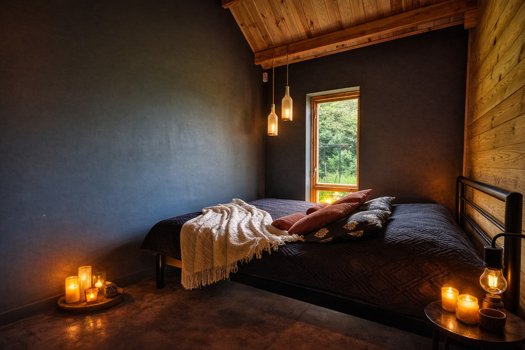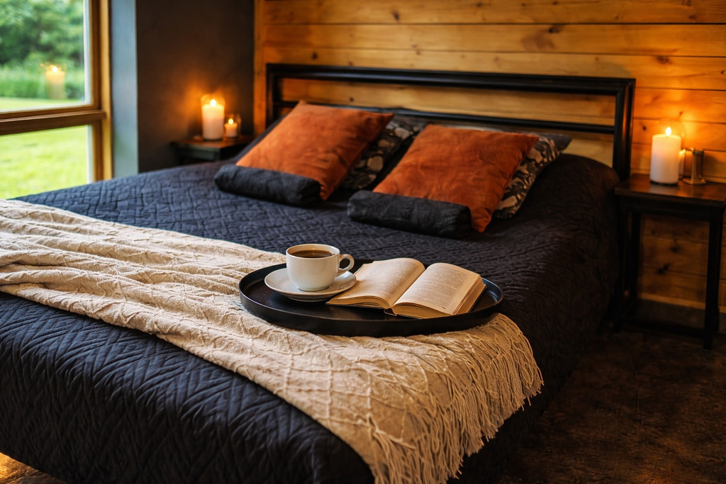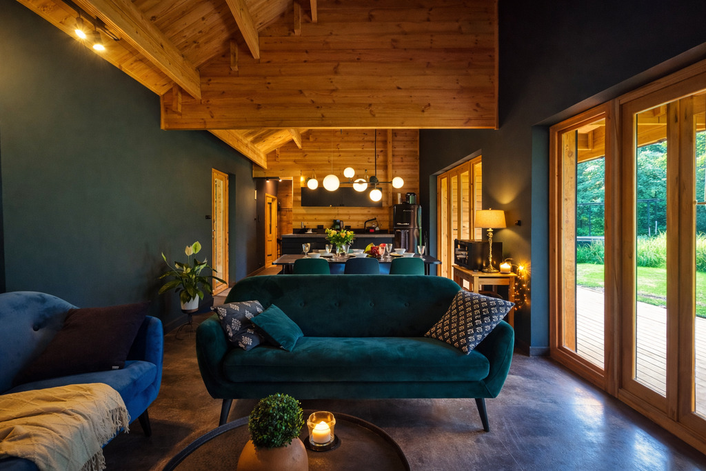 Wnętrze zaprojektowano w stylu skandynawskim (hygge), z wykorzystaniem naturalnych materiałów oraz dodatków od polskich i duńskich producentów. Stonowana kolorystyka ziemi sprzyja wyciszeniu i regeneracji. Dom jest w pełni umeblowany i gotowy zarówno do zamieszkania, jak i kontynuowania wynajmu.