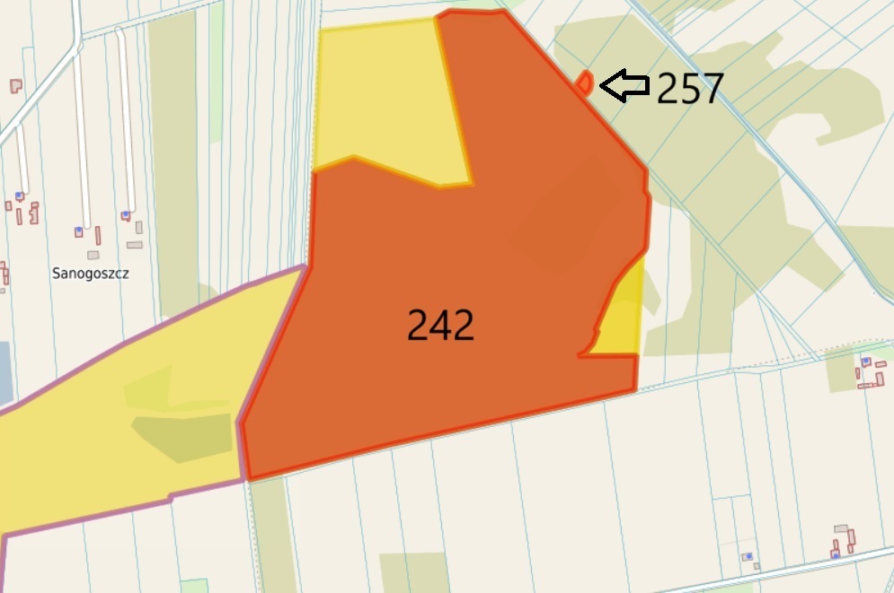 – Działka nr 242, o powierzchni 210 900 m2 (oznaczenie ŁIV, ŁV, ŁVI, PsIV, PsV, W, Wsr-ŁV, Wsr, Lzr-ŁVI, N).
