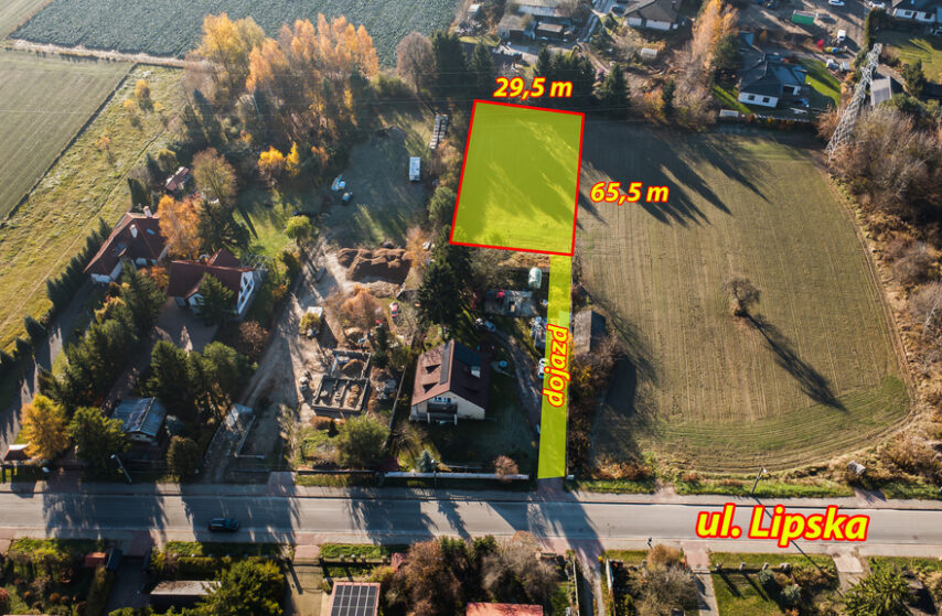 - Wymiary działki: 29,5 m x 65,5 m (kształt prostokąta).