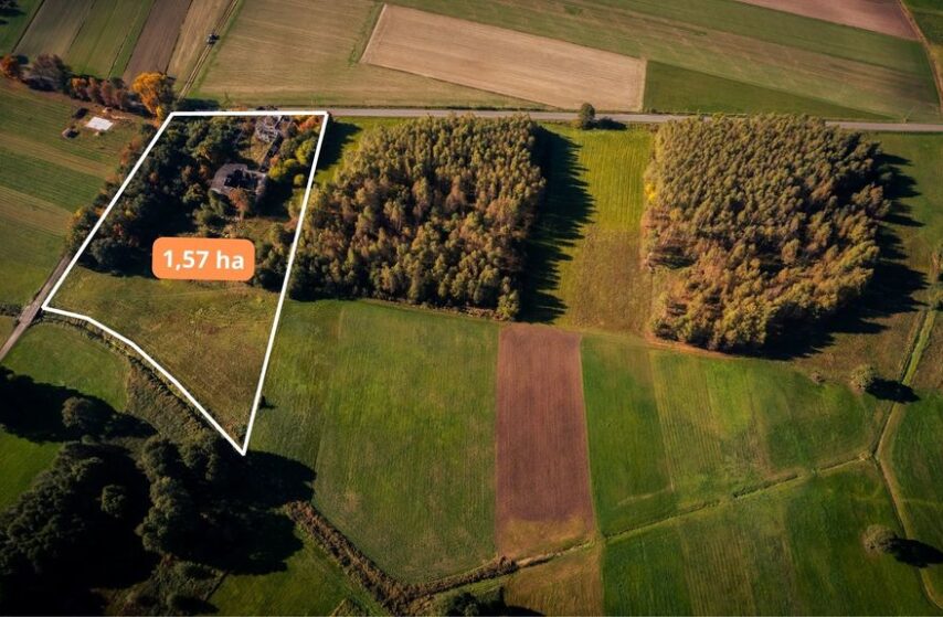 Nieruchomość to dawne gospodarstwo o łącznej powierzchni 1,57 ha. S Granice gospodarstwa rozciągają się na długości ponad 85 metrów wzdłuż gminnej drogi pokrytej asfaltem. Z drugiej strony nieruchomość ma bezpośredni dostęp do rzeki Miazgi, na której zbudowany jest drewniany most.