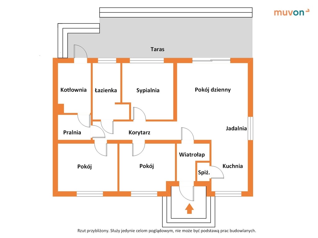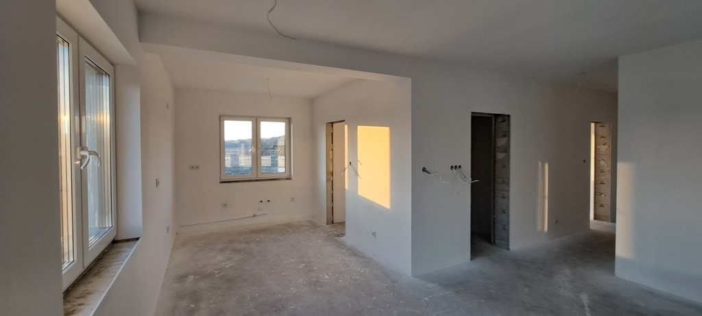 - Układ pomieszczeń: 3 pokoje, salon z otwartą kuchnią, łazienka, pralnia, kotłownia, taras.