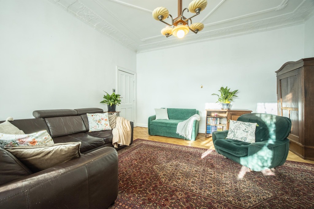 • trzy przestronne, wysokie pokoje (dwa przechodnie), które zachowały oryginalne sztukaterie i parkiet,