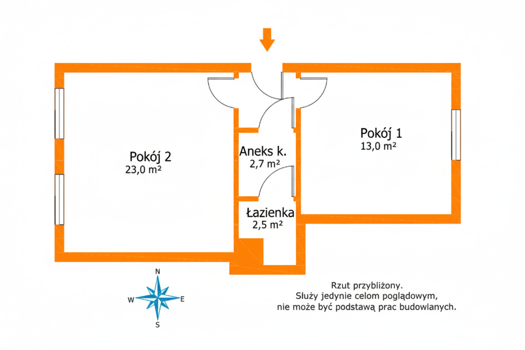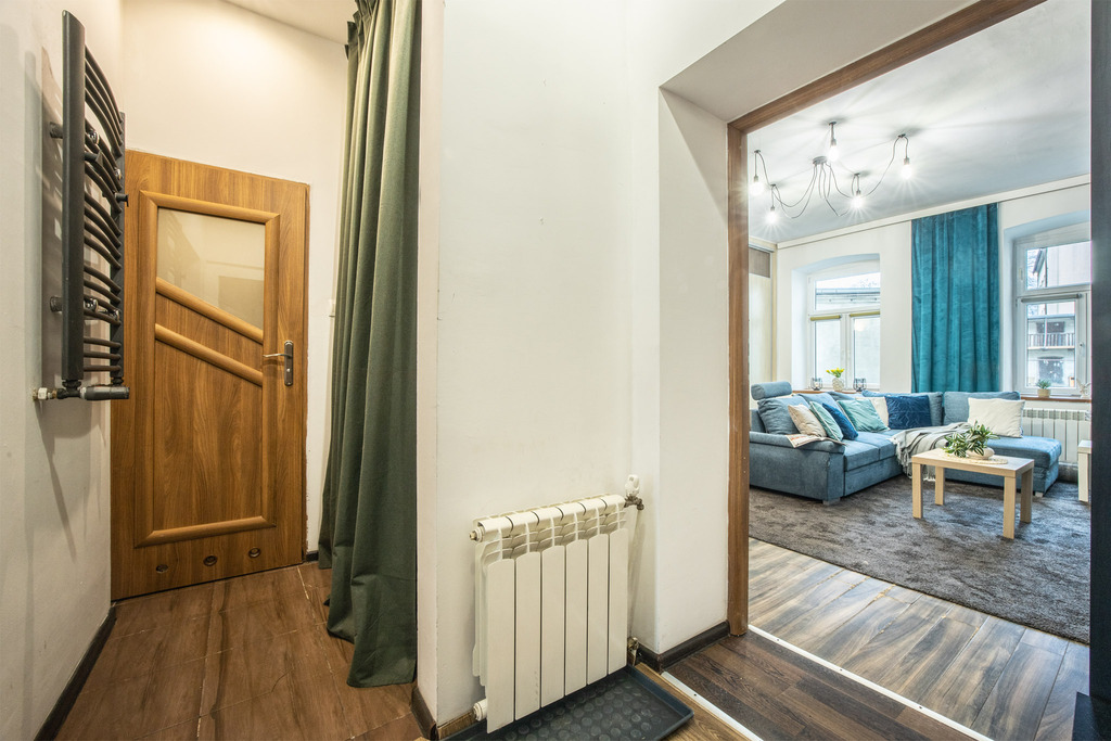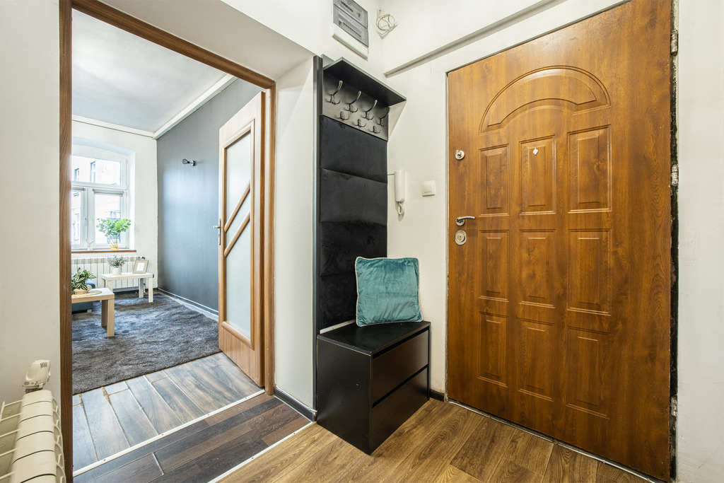 Mieszkanie składa się z dwóch dużych, funkcjonalnych pomieszczeń o powierzchni ok. 25 m² i 18 m², oddzielnej kuchni, łazienki oraz przedpokoju. W większym pokoju wyprowadzono instalacje pod aneks kuchenny, co daje możliwość łatwego przearanżowania wnętrza i stworzenia nowoczesnej strefy dziennej lub dodatkowego pomieszczenia. Wysokie, około 3-metrowe sufity nadają mieszkaniu wyjątkowego charakteru i poczucia przestrzeni.