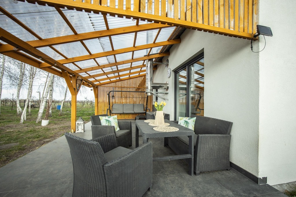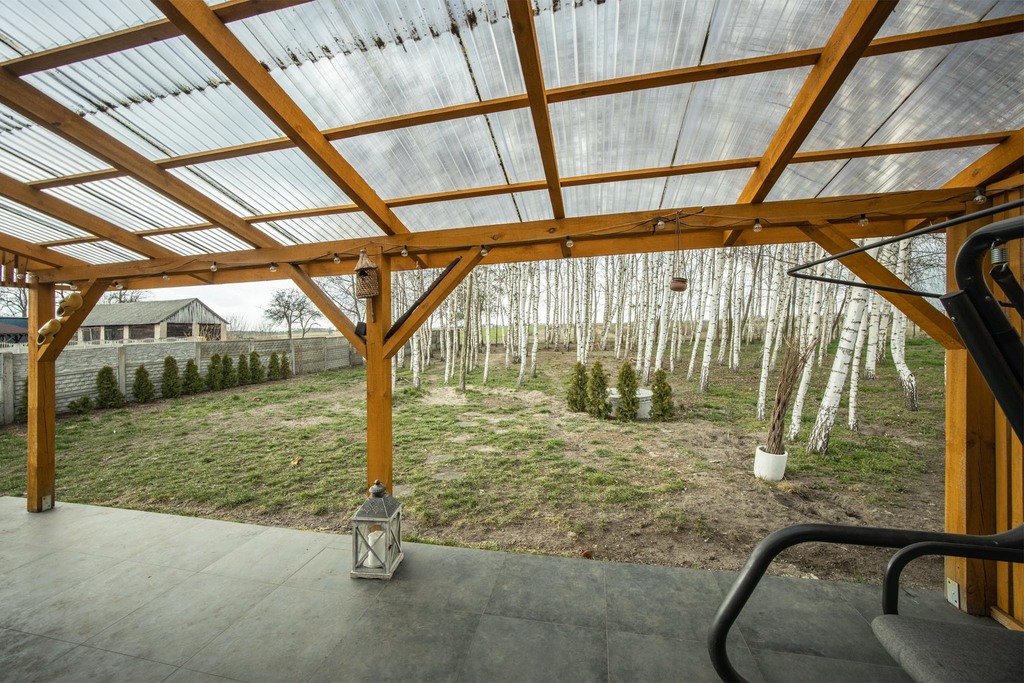 - wyjście na zadaszony taras 20 m² z widokiem na prywatny lasek brzozowy.