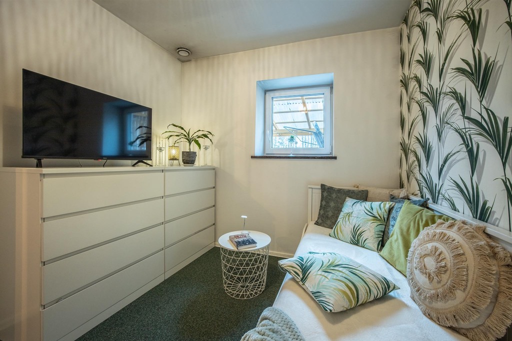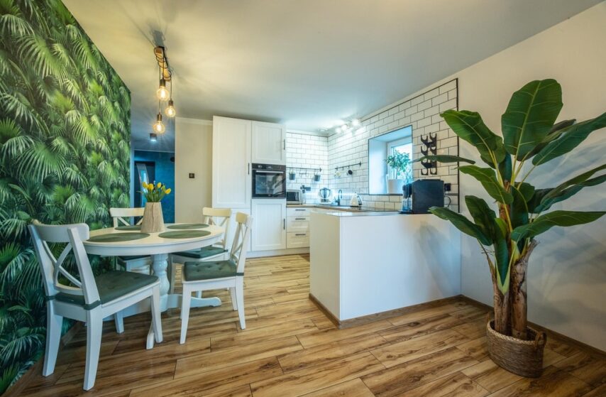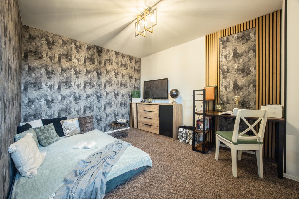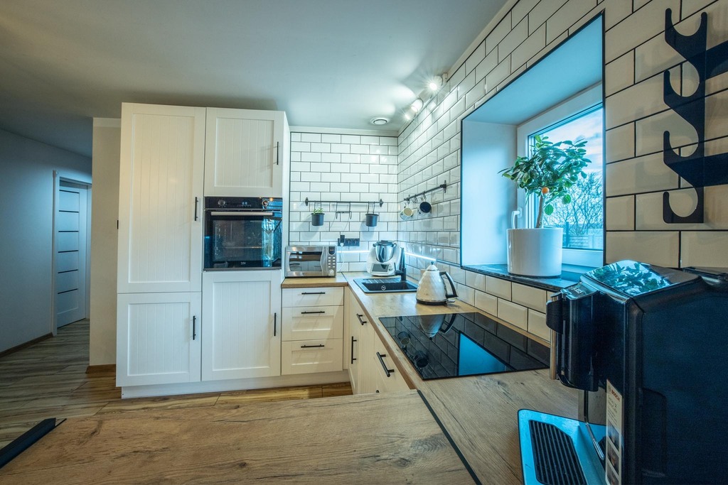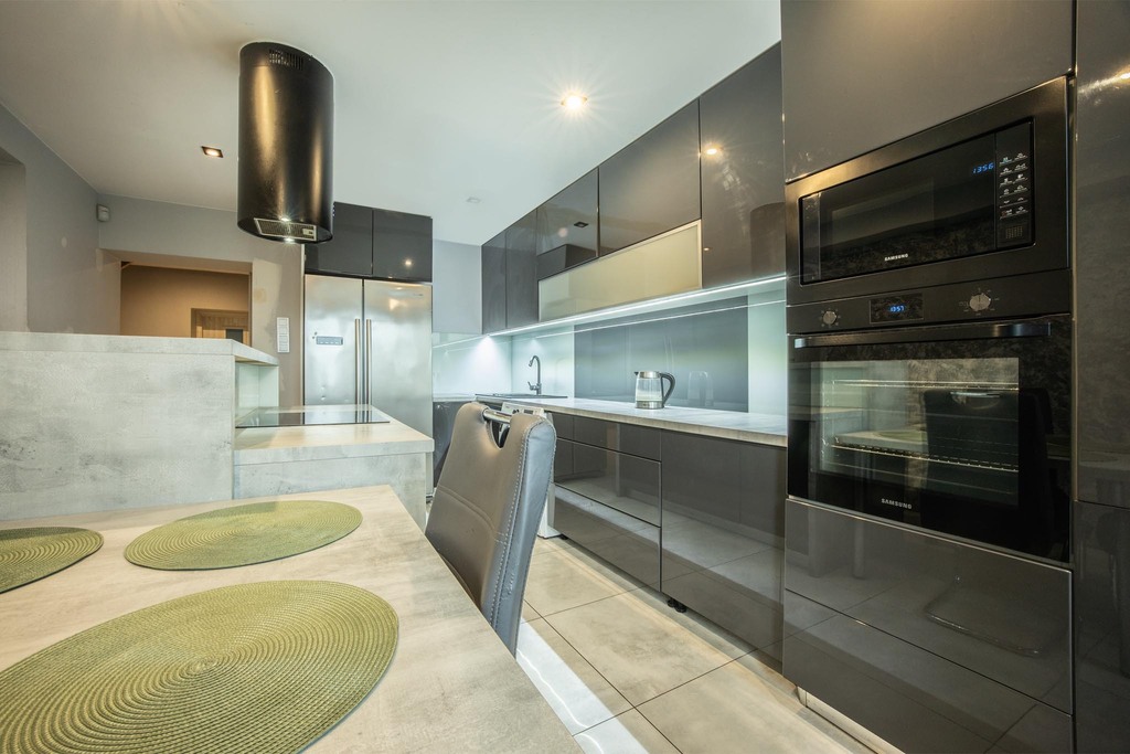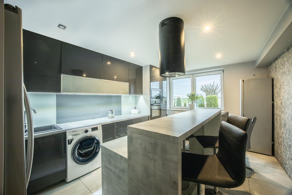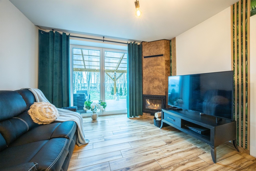 - jasny salon z otwartą kuchnią – idealne miejsce do spotkań,