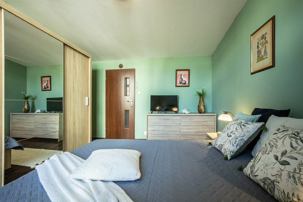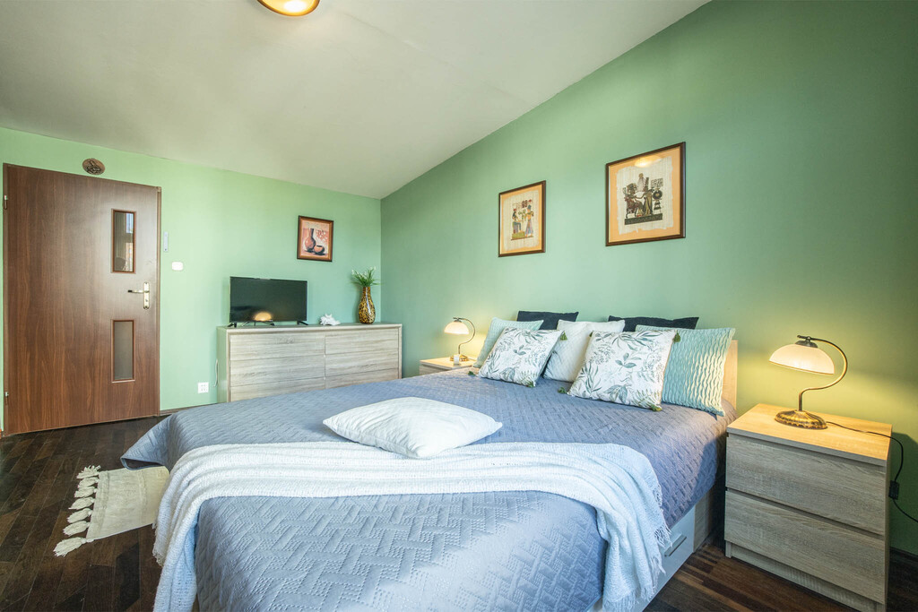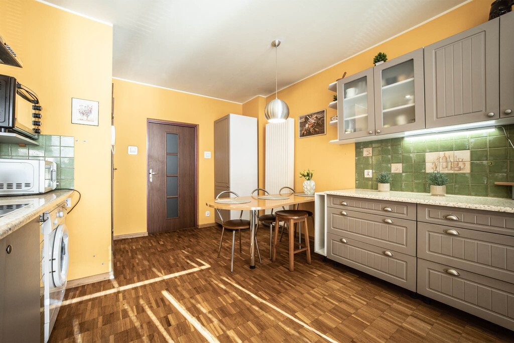 - Spokój w centrum: Choć to serce miasta, okna mieszkania wychodzą na ciche podwórko, oferując intymność i kojący widok, który wieczorami rozświetlają miejskie iluminacje.