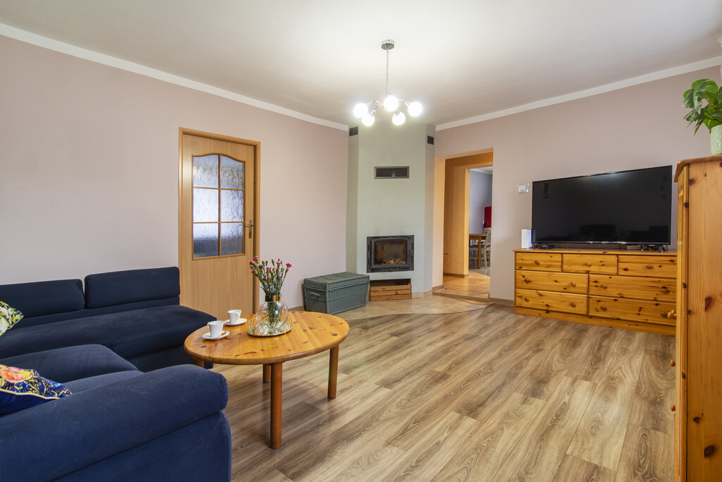 – przestronny salon z kominkiem – idealne miejsce na relaks przy blasku ognia,