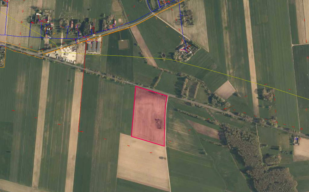 Działka z trzech stron ograniczona drogą krajową i gminną.