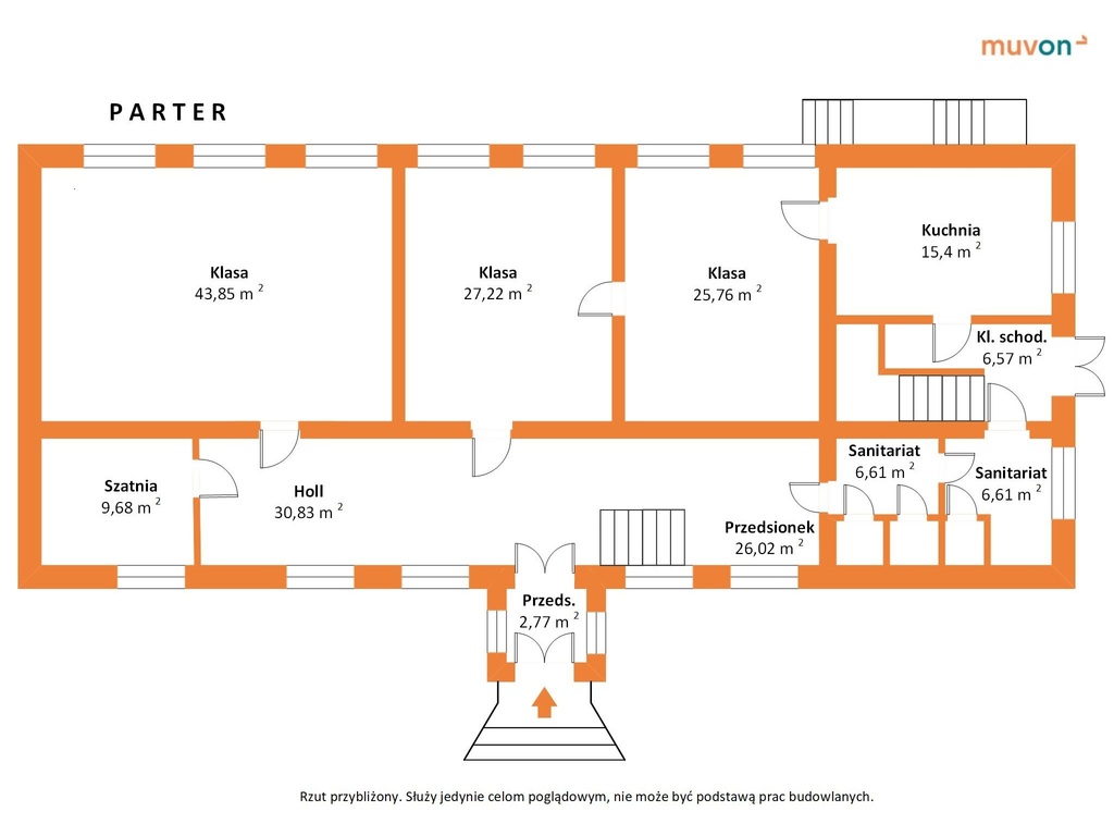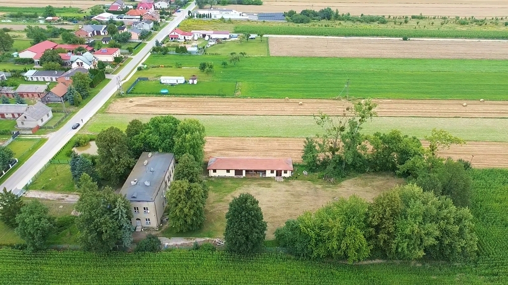 Na nieruchomości znajduje się budynek główny o powierzchni użytkowej ok. 362 m², wzniesiony w 1936 roku z cegły. Obiekt był niegdyś szkołą, a obecnie czeka na nowego właściciela, który nada mu nową funkcję. Budynek jest dwukondygnacyjny, z poddaszem oraz częściowym podpiwniczeniem (ok. 45 m²). Dach został odnowiony w 2010 roku (papa). Wewnątrz znajduje się 10 przestronnych pomieszczeń, sanitariaty oraz wygodne korytarze komunikacyjne, które można z łatwością zaadaptować na potrzeby nowoczesnych usług lub siedzibę firmy.