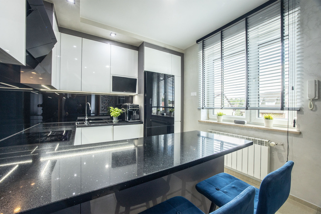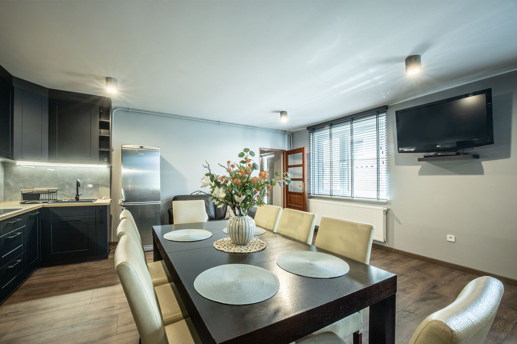 – przestronnego salonu z aneksem kuchennym,
