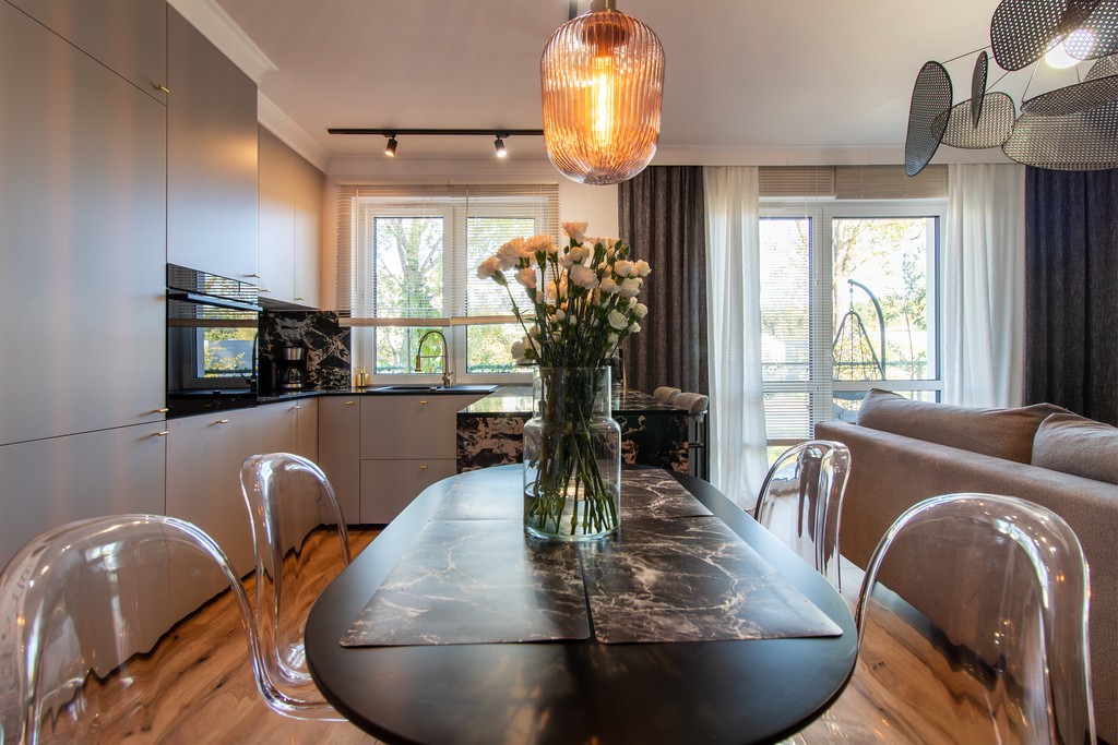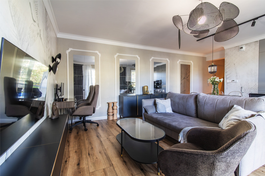 Mieszkanie charakteryzuje się designerskimi wnętrzamii, które wpuszczają do wnętrza mnóstwo naturalnego światła, tworząc przytulną i jasną atmosferę. Przestronny salon wykończony w najmodniejszych kolorach z otwartą kuchnią to idealne miejsce do spędzania czasu z rodziną oraz przyjaciółmi. Wysokiej jakości materiały wykończeniowe oraz ponadczasowy elegancki design sprawiają, że wnętrze jest zarówno piękne jak i funkcjonalne. Wnętrze zostało zaprojektowane przez kreatorkę wnętrz. Mieszkanie jest przestronne i jasne oraz nie wymaga żadnych nakładów remontowych.
