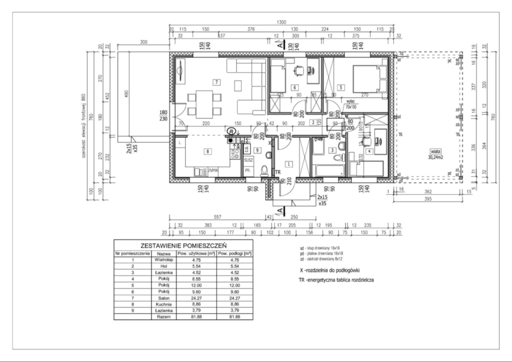 Dom został wykonany w nowoczesnej technologii z naciskiem na parametry energooszczędne, co wpływa na niskie koszty eksploatacji i komfort użytkowania.