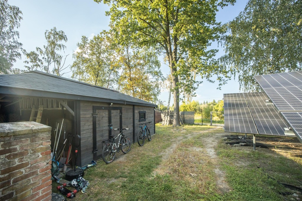 - Instalacja paneli słonecznych umieszczona w głębi ogrodu.