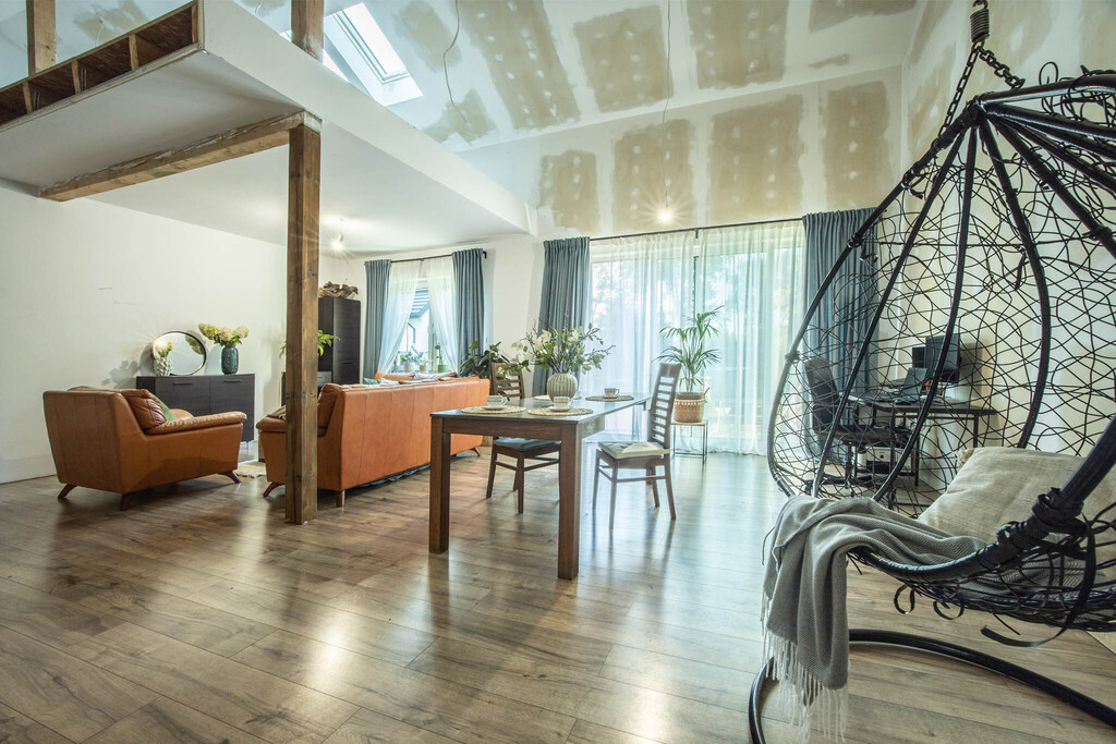 - Nowoczesny design – duże przesuwne okno tarasowe, jasne wnętrza, wysoki salon z antresolą.