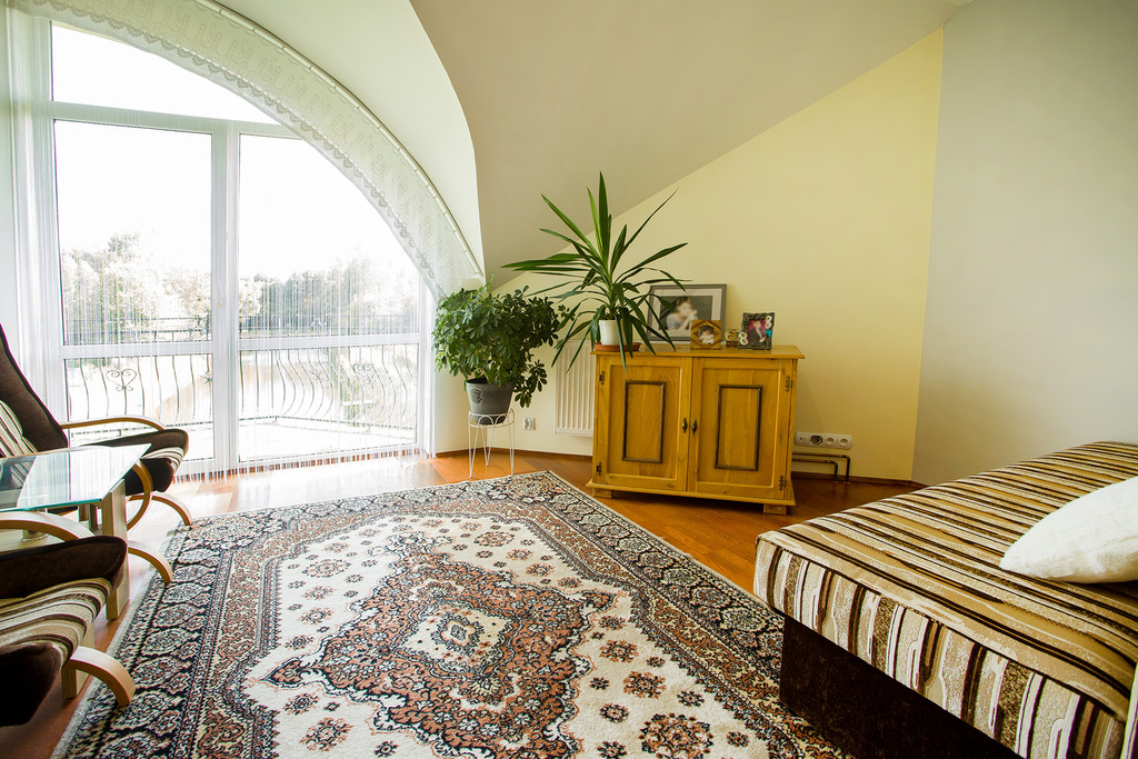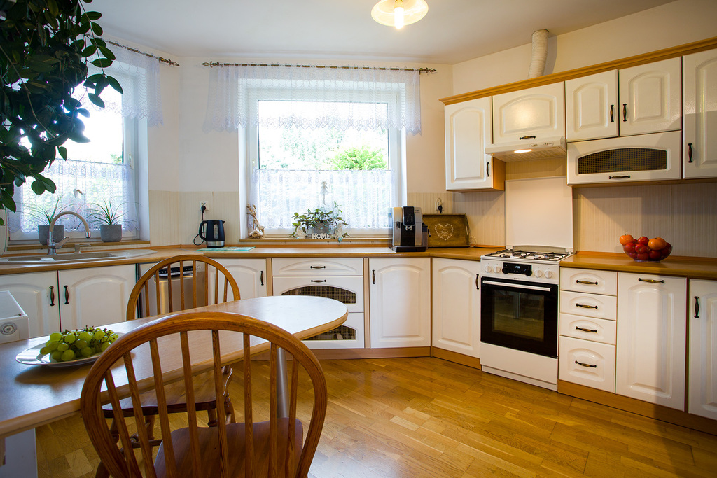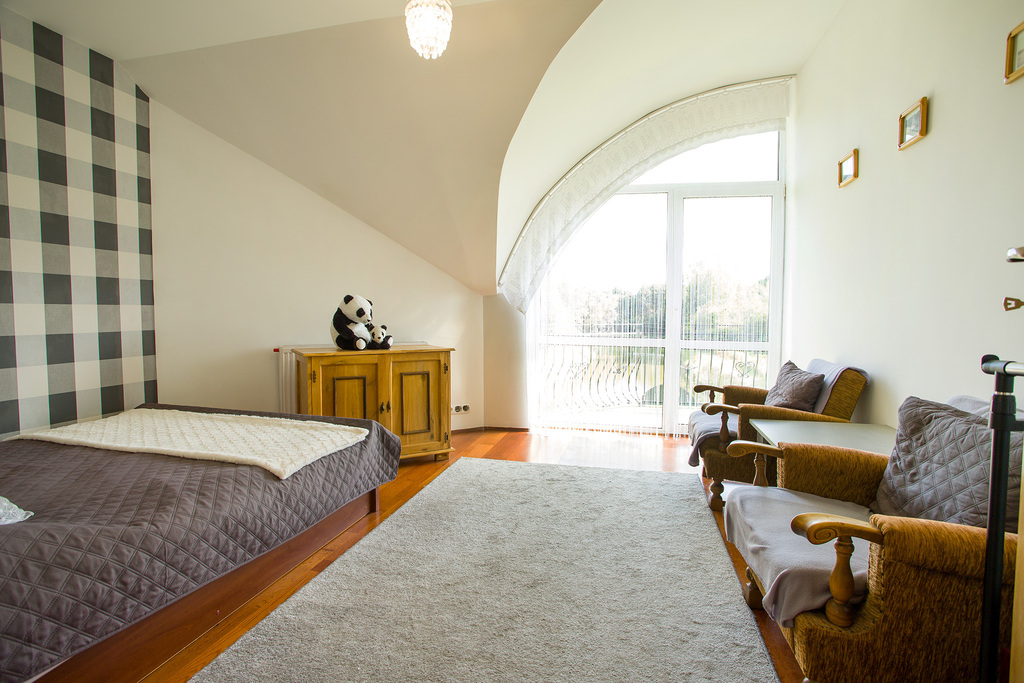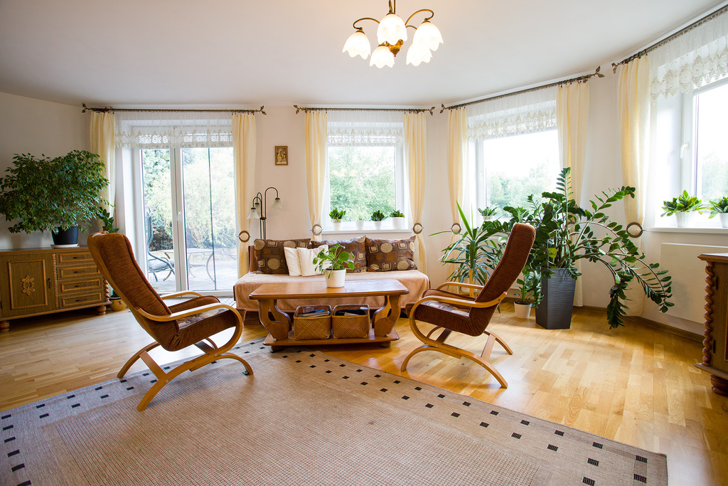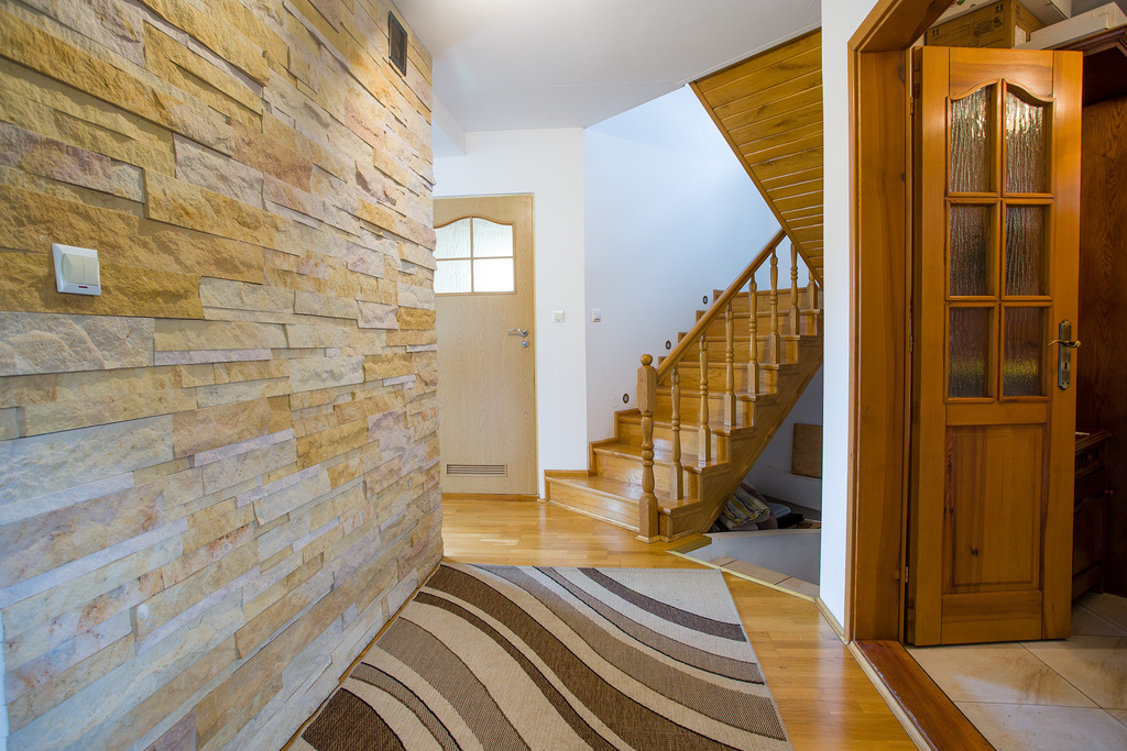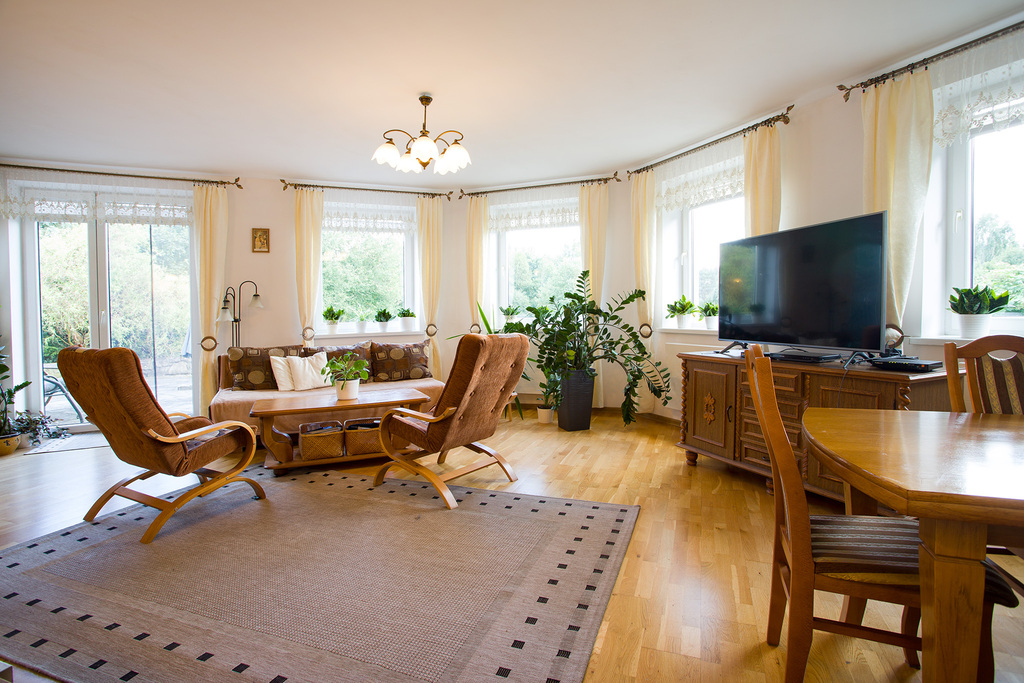 Energooszczędny i komfortowy dom urządzony z wykorzystaniem naturalnych materiałów (dębowe schody, ściana wyłożona kamieniem, drewniany parkiet), pełen naturalnego światła (okna wykonane na wymiar) to przestrzeń, której idealnym dopełnieniem jest malownicze otoczenie.