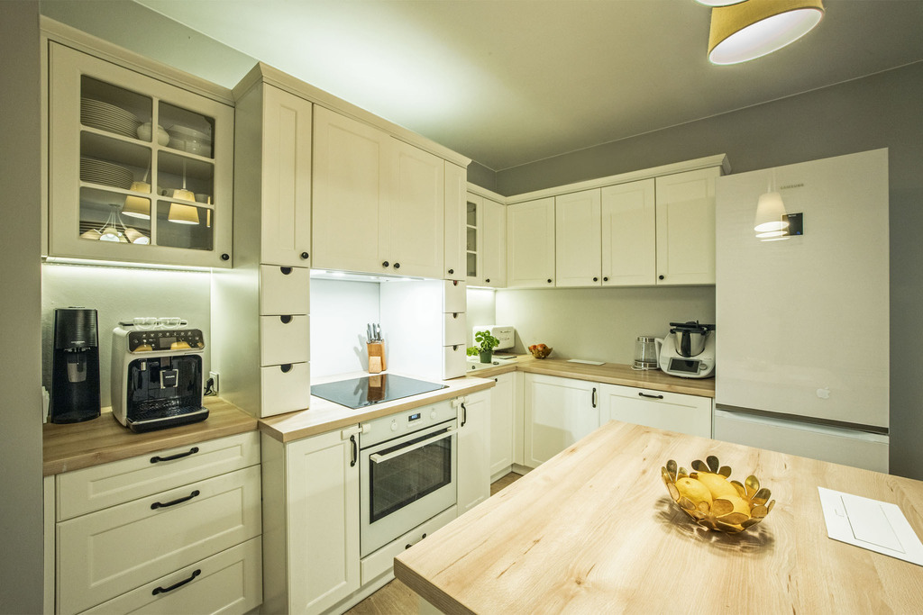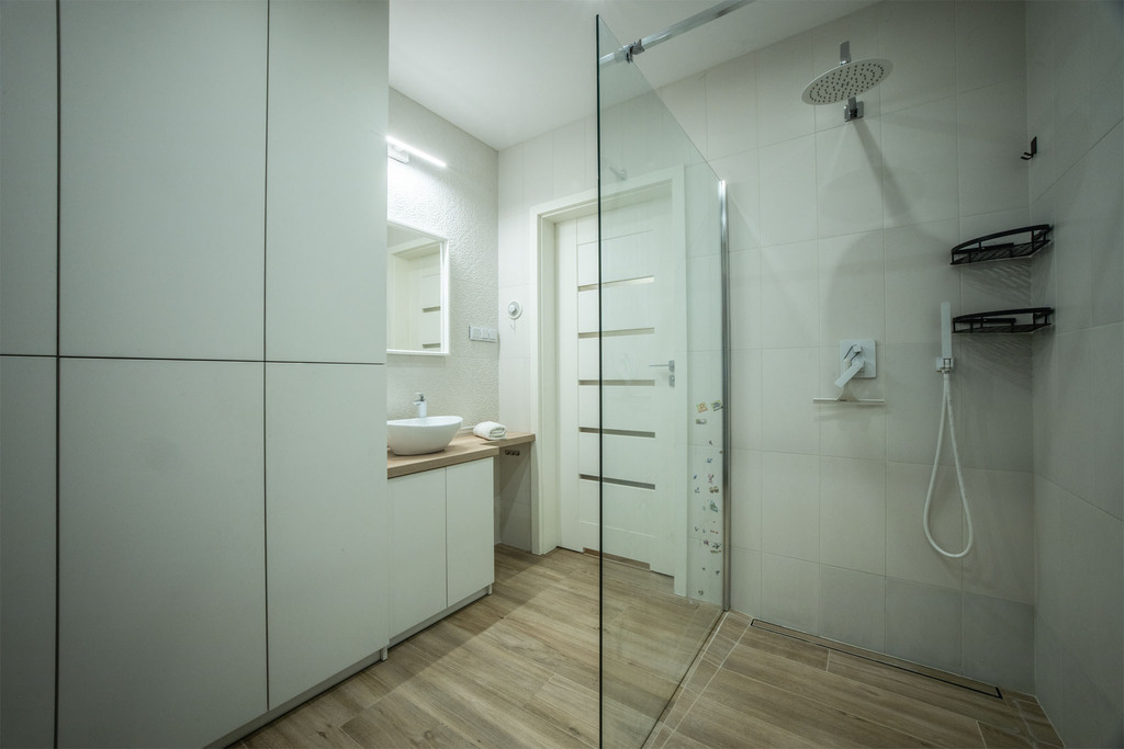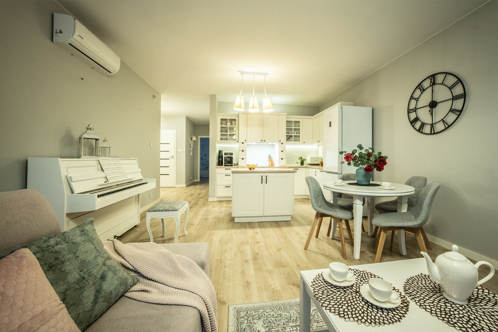 - Ogrzewanie podłogowe w całym mieszkaniu zapewnia równomierny komfort cieplny bez potrzeby instalowania grzejników.