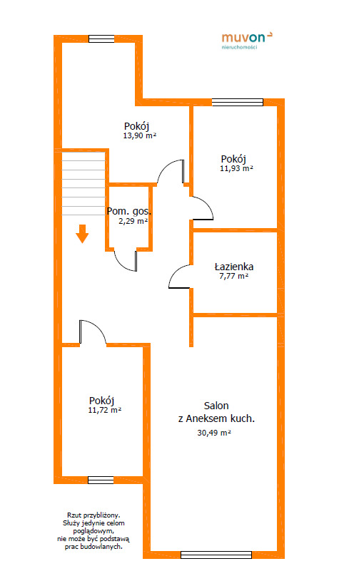 - Pokój 2 (13,9 m²) – doskonały na główną sypialnię lub pokój dziecięcy.