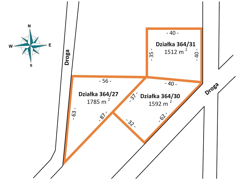 - 364/27 – 1785 m² – dojazd od ul. Pozytywnej (oświetlona, utwardzona uliczka osiedlowa).