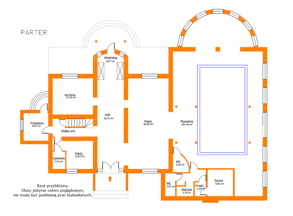 - w bryle budynku znajduje się kryty basen (ok. 2,5 m głębokości),