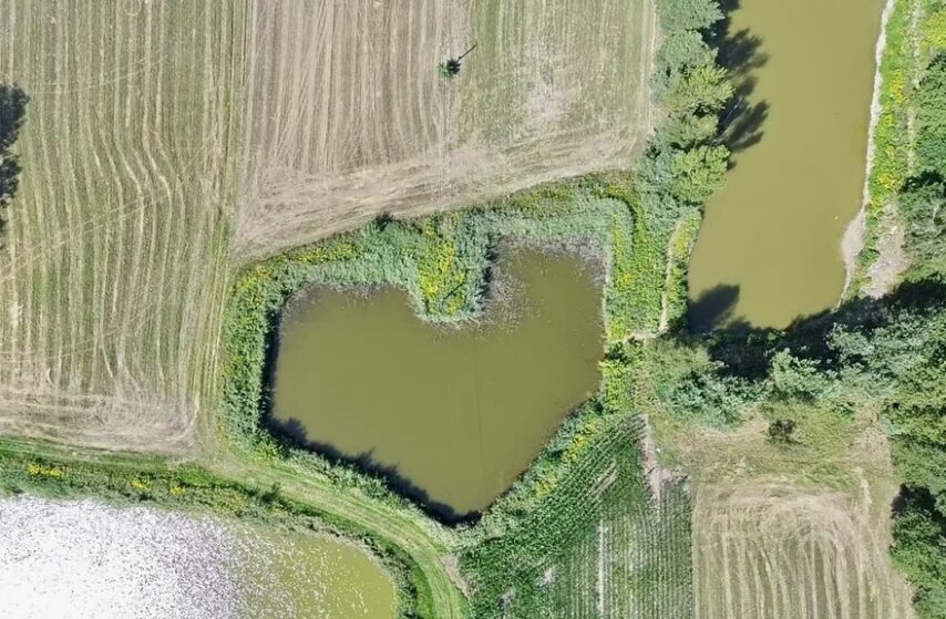 Słońce wschodzi nad linią lasu, a Ty z kubkiem kawy stoisz na wzgórzu, spoglądając na taflę wody – może to być staw w kształcie serca.