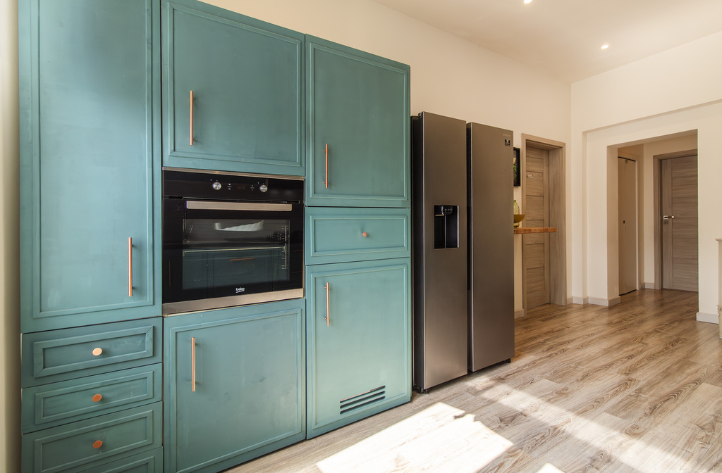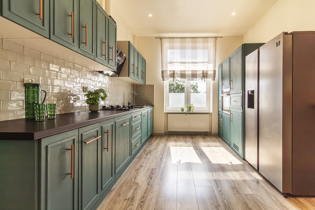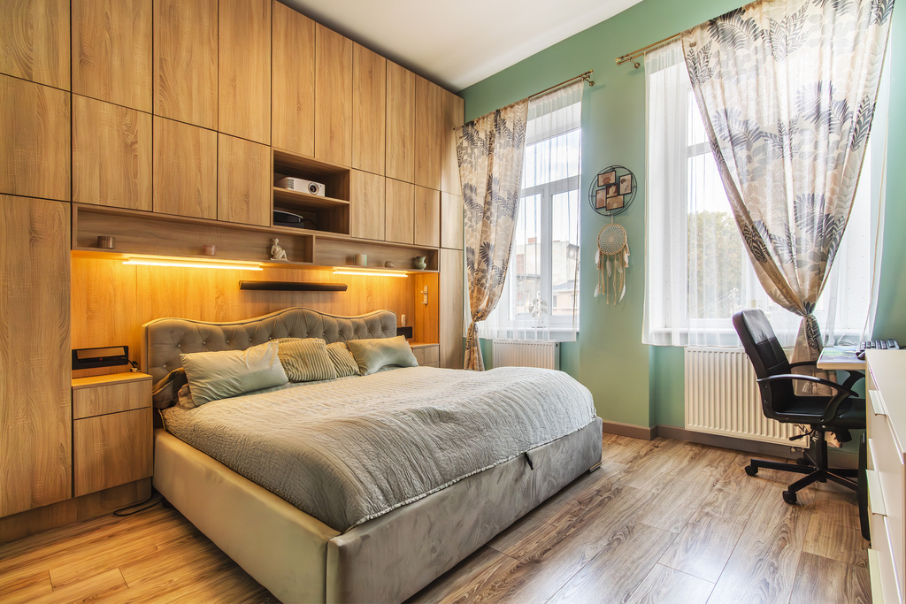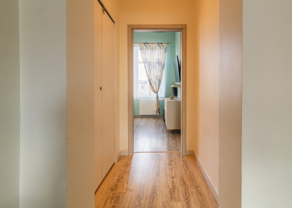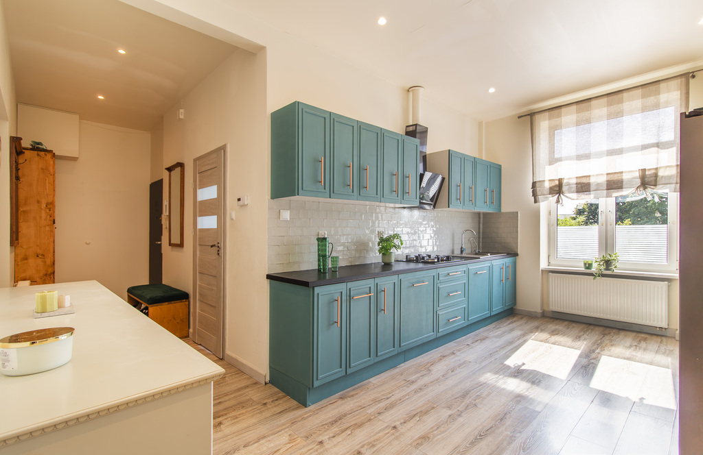 Mieszkanie zachwyca elegancją i przytulnym klimatem. Stałe, drewniane zabudowy podkreślają charakter wnętrza, a jednocześnie oferują dużo miejsca do przechowywania. To przestrzeń, w której każdy element ma swoje miejsce i znaczenie.