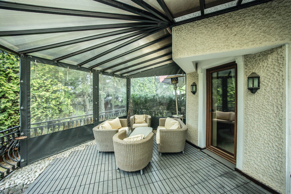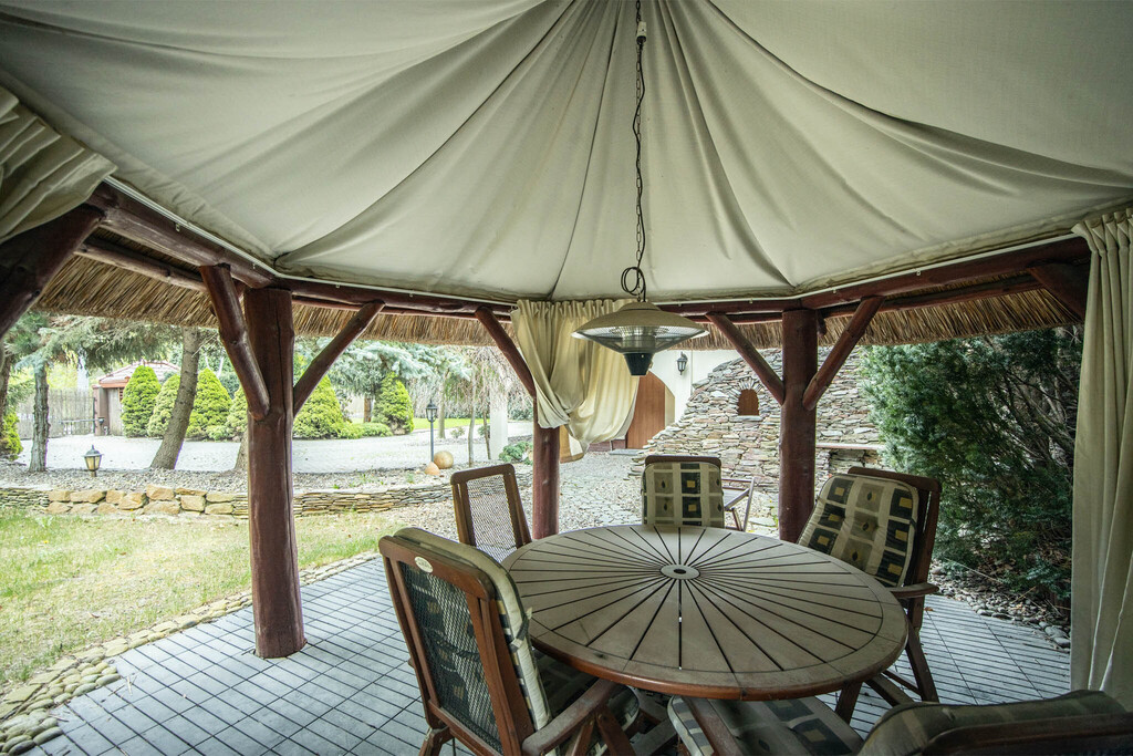 Każdy element zewnętrznej przestrzeni został przemyślany z dbałością o najmniejszy szczegół – od zachwycającego oczka wodnego wpisanego w ogród wprowadzającego spokój i harmonię, przez romantyczną altankę idealną na letnie wieczory zapewniającą udane spotkania towarzyskie czy też wyciszenie przy książce, po dwa eleganckie tarasy pozwalające cieszyć się pięknem otoczenia.