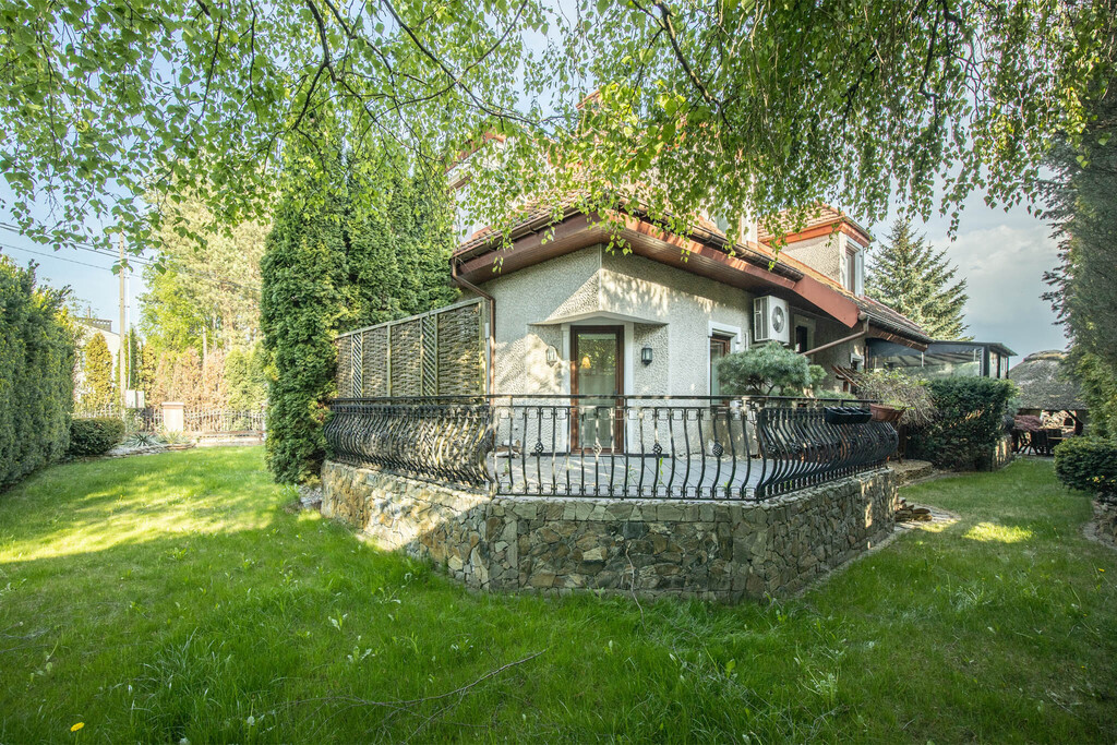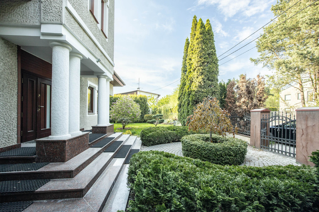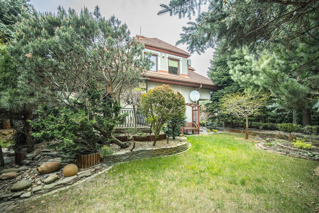 Na przepięknie zagospodarowanej działce o powierzchni 1297 m² znajduje się majestatyczny dom o powierzchni całkowitej 344,48 m² (użytkowej 270 m²) otoczony profesjonalnie zaprojektowanym ogrodem.