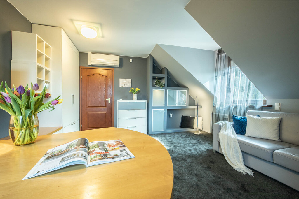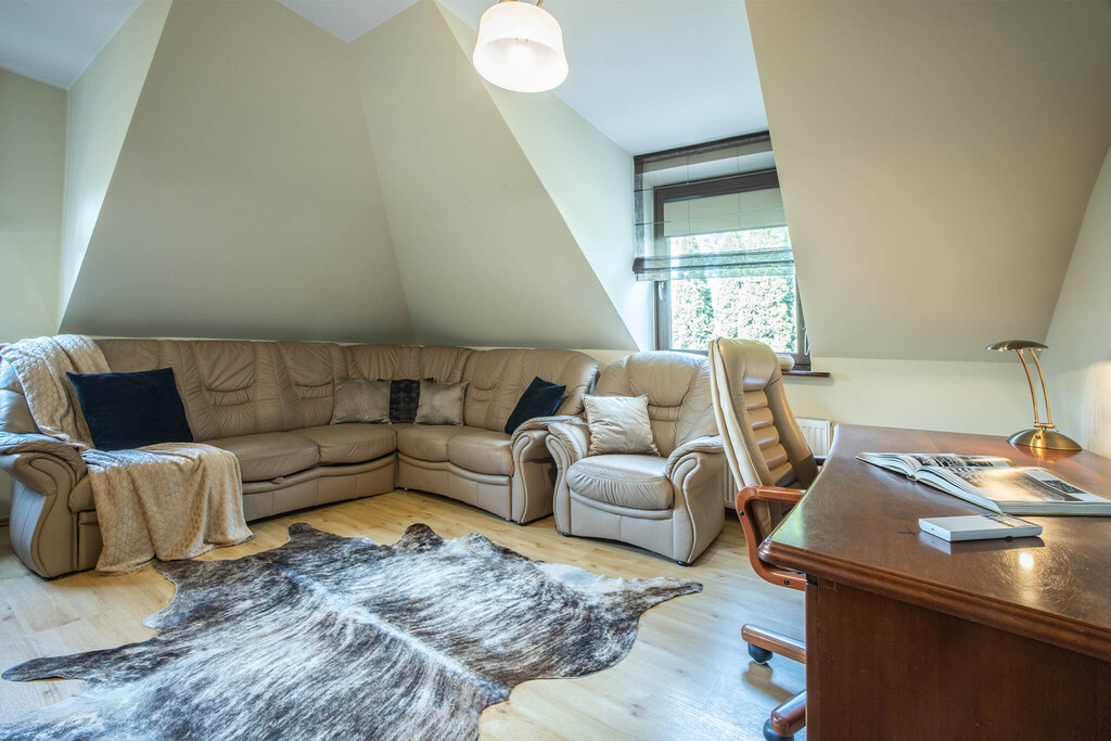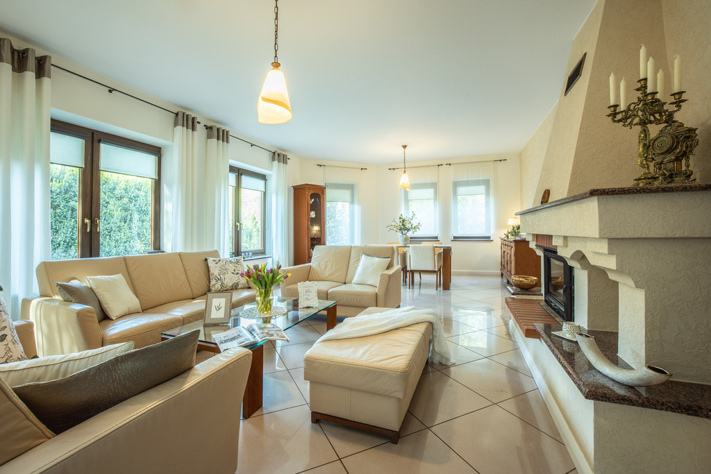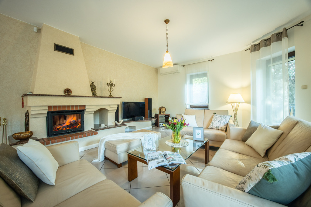 - Obszerny salon idealny do wypoczynku i przyjmowania gości.