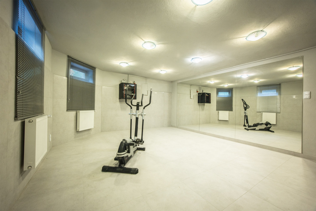 - Siłownia (wykafelkowane pomieszczenie z lustrem na całej ścianie).