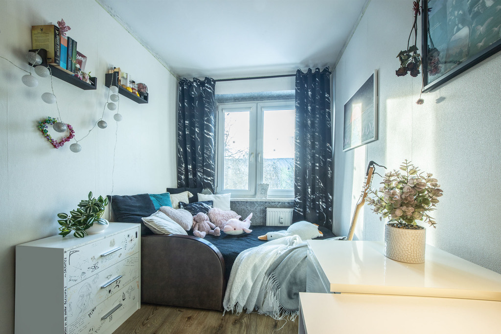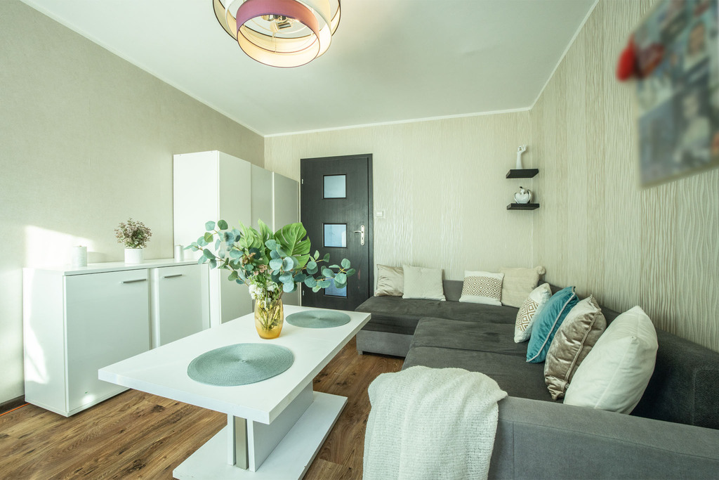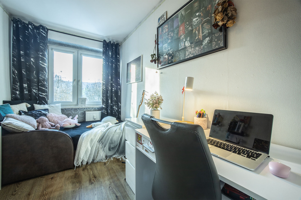 • Podłogi: W pokojach znajdują się zadbane panele, nadające wnętrzom przytulny charakter.