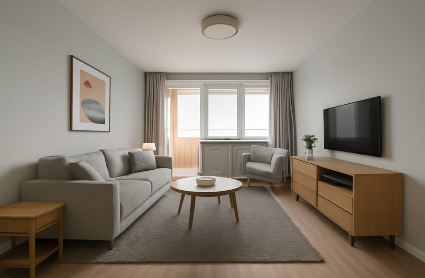 Pierwsze dwa zdjęcia w ofercie to wizualizacja salonu i sypialni.