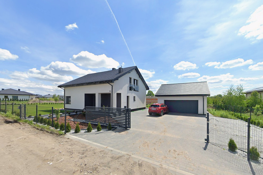 - Przestrzeń: Podjazd z kostki brukowej prowadzi do dużego, wolnostojącego garażu (36 m²), który pomieści nie tylko samochody, ale i Twój sprzęt hobbystyczny.
