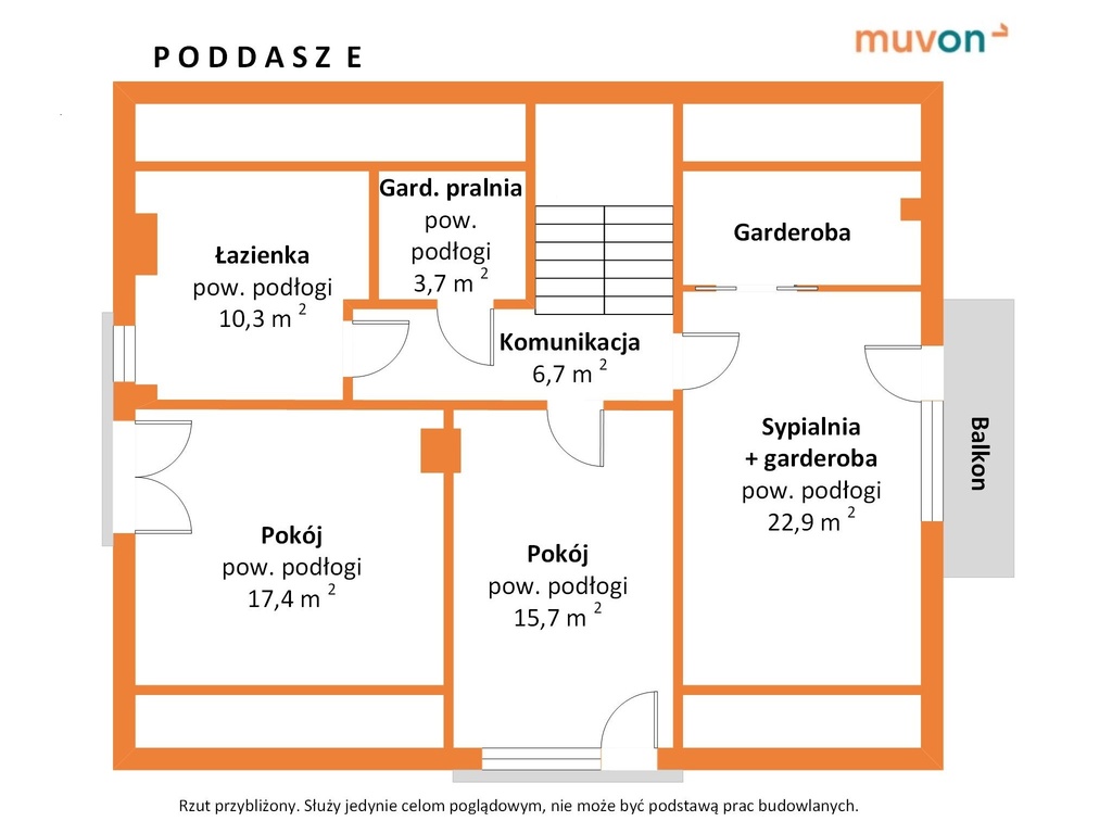 Piętro (Strefa Prywatna): Trzy przestronne i ustawne sypialnie gwarantują intymność każdemu członkowi rodziny. Główna łazienka to prawdziwy pokój kąpielowy z wanną i prysznicem, a dedykowana pralnia ułatwia codzienne obowiązki.