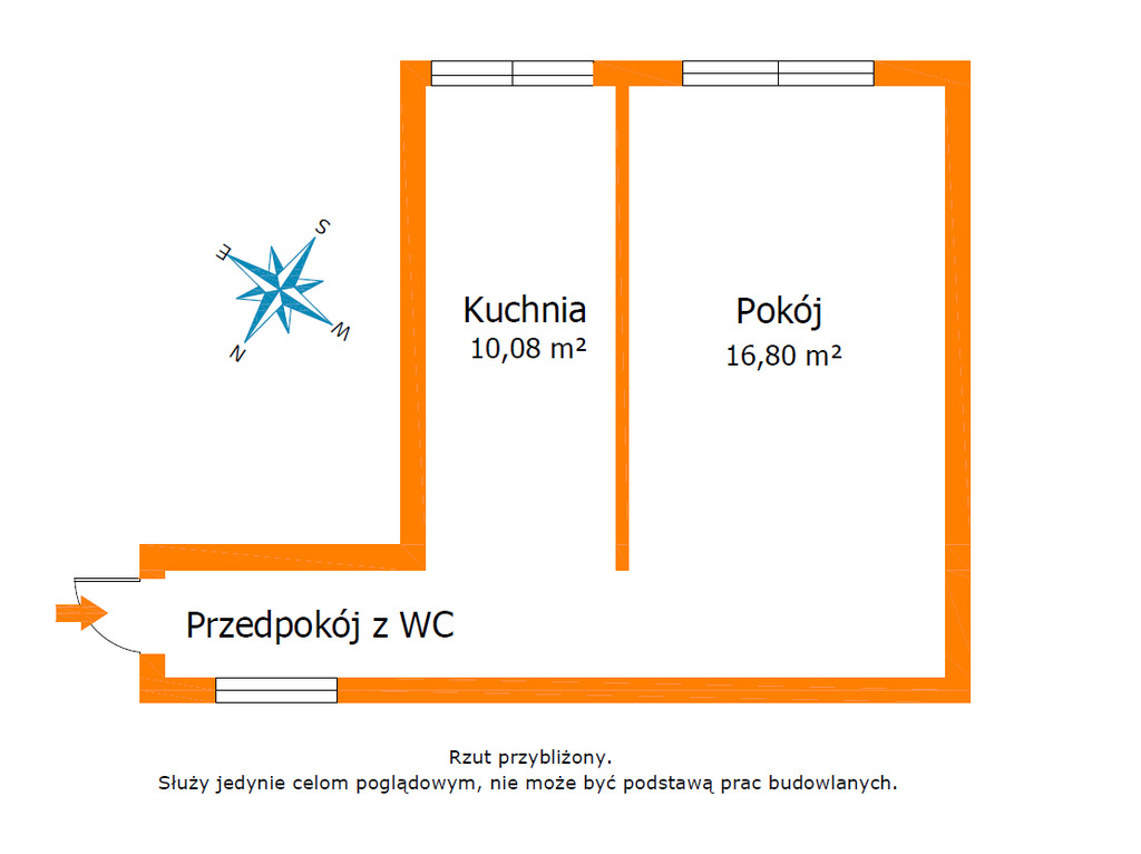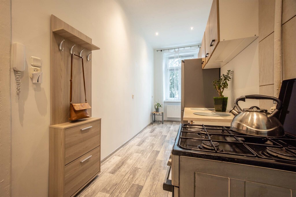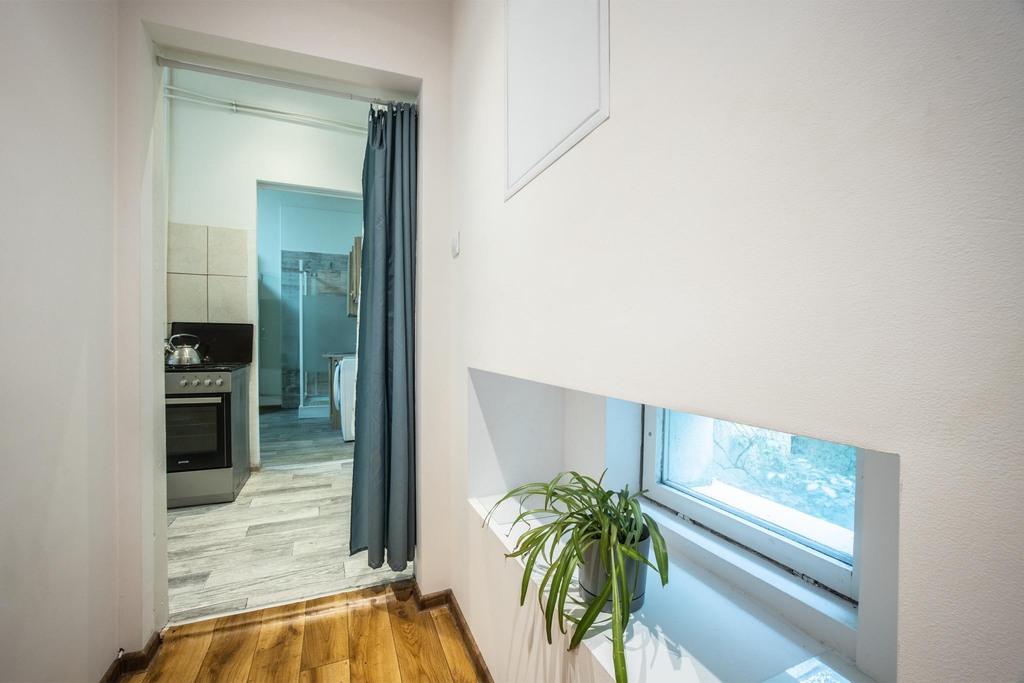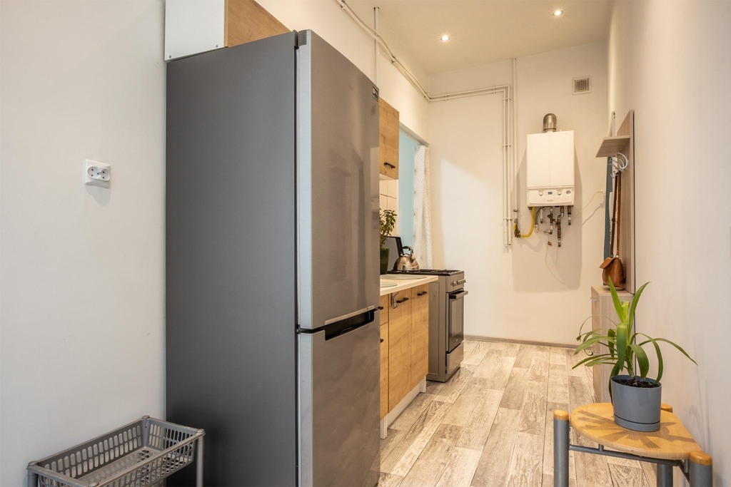 Lokal składa się z pokoju dziennego, oddzielnej kuchni oraz przedpokoju. Obecnie mieszkanie jest w stanie umożliwiającym zamieszkanie od zaraz, a przy tym daje duże możliwości aranżacyjnych. Wymaga wydzielenia łazienki, układ pomieszczeń pozwala na wygodne rozplanowanie przestrzeni.