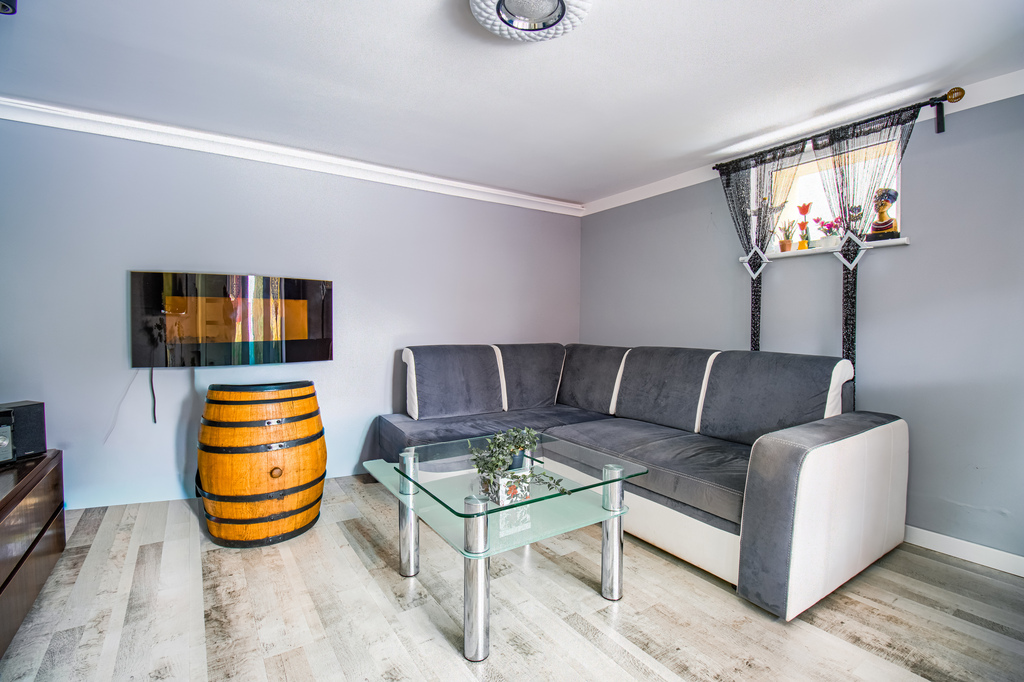 DOM GŁÓWNY – przestronny bliźniak po generalnym remoncie (ok. 150 m²) Dom z 1990 roku, rozplanowany na trzech poziomach, po kompleksowych pracach modernizacyjnych obejmujących m.in. wymianę instalacji, nowy dach, ocieplenie i elewację. Dzięki temu charakteryzuje się niskimi kosztami utrzymania.