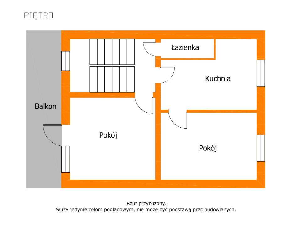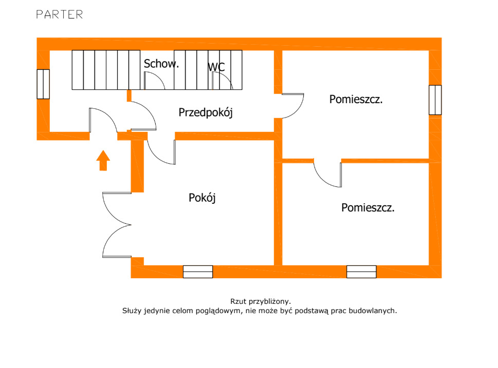 - Parter: kuchnia z jadalnią, dwa pokoje, łazienka